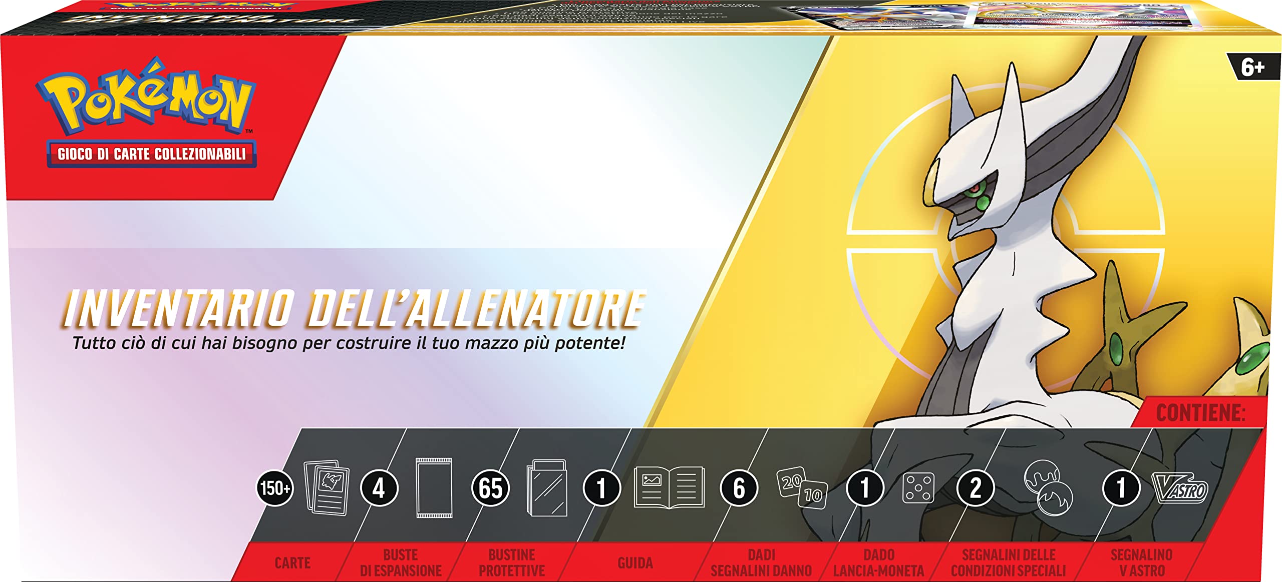 Everything you need to build your most powerful deck!Turn your card collection into a series of fun competition decks from the Pokémon Trading Card Game!Inside this box you'll find a pool of Trainer cards and Energy cards, plus a deck building guide to learn how to combine them and create a deck that showcases your most powerful Pokémon. You'll have everything you need to answer crucial questions such as need more powerful Pokémon? Maybe more Trainer cards? When to stop with Energy?Discover completely new decks, original combinations and a world of fun in your head-to-head fights with the Pokémon TCG Trainer Inventory!Pokémon TCG Trainer Inventory contains:• More than 50 useful cards to upgrade your decks, including tons of Trainer cards, Arceus-V and Arceus-V ASTRO cards• More than 100 Basic Energy cards• Four Pokémon TCG booster packs• 65 protective bags• A deck building guide• Six damage marker dice• A coin launcher dice valid for races• Two special condition markers• One V ASTRO Plexiglas marker• A code card for the Pokémon Live TCG