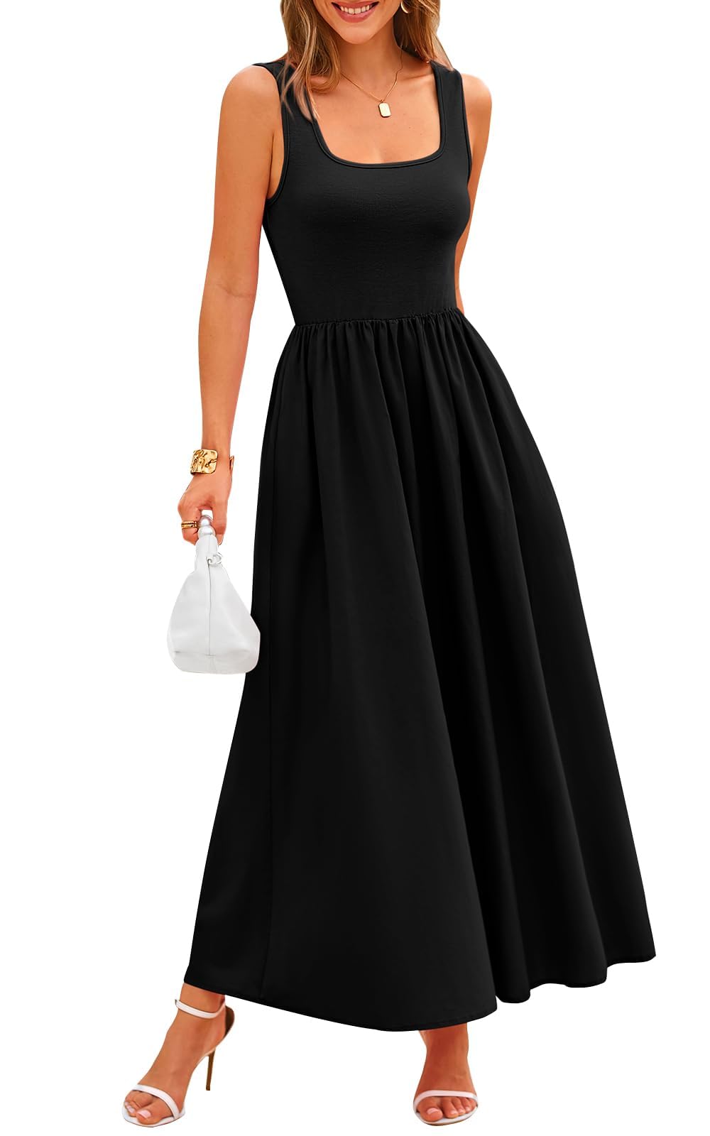 Potany Summer Dresses for Women Casual Sleeveless Square Neck Flowy Long Black A Line Beach Vacation Maxi Tank Sun Dress 2024 Spring Outifts with Pockets(Black,L)