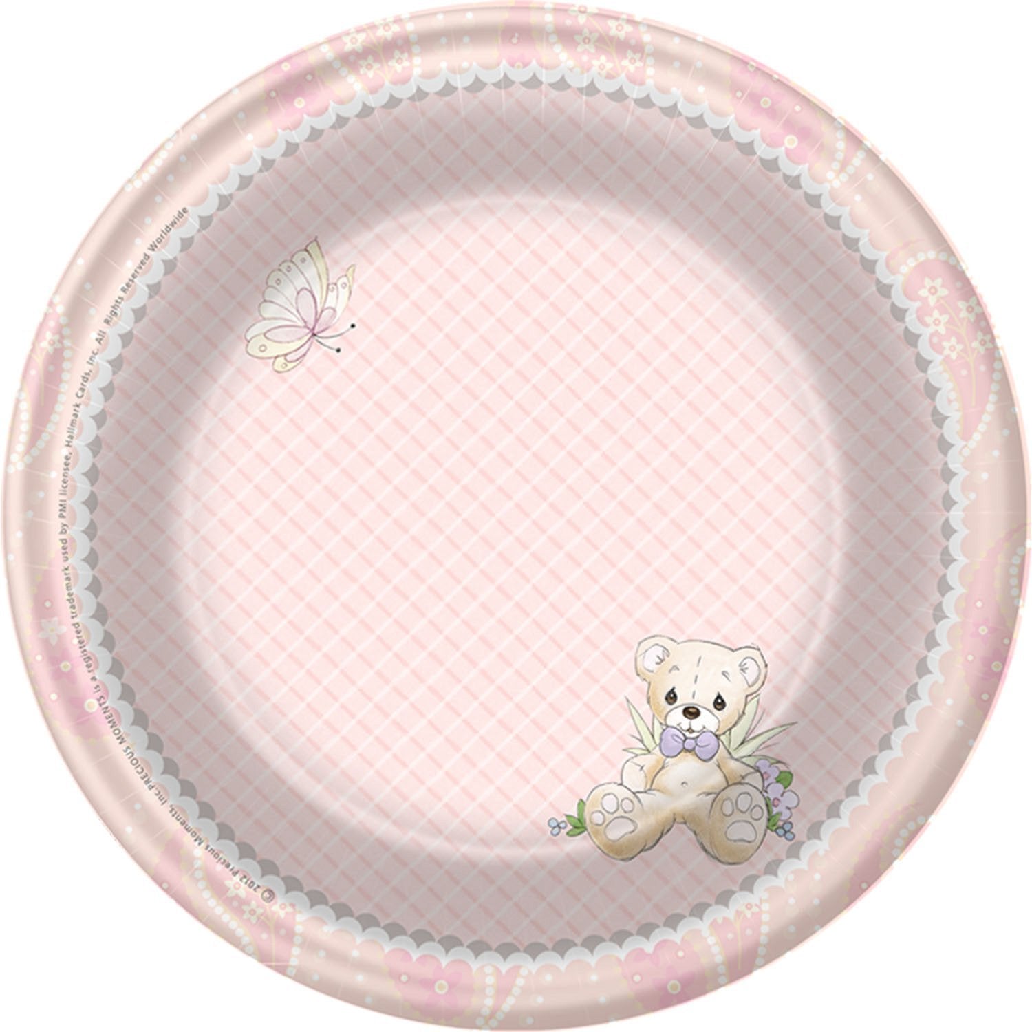 Want a sweet way to set the table for a baby shower? The Precious Moments Baby Girl Dessert Plates feature a teddy bear and soft pink hues. Use the 7-inch plates with other Precious Moments pieces for a darling look! They're great for appetizers and finger foods as well as treats! Each pack has 8 plates.