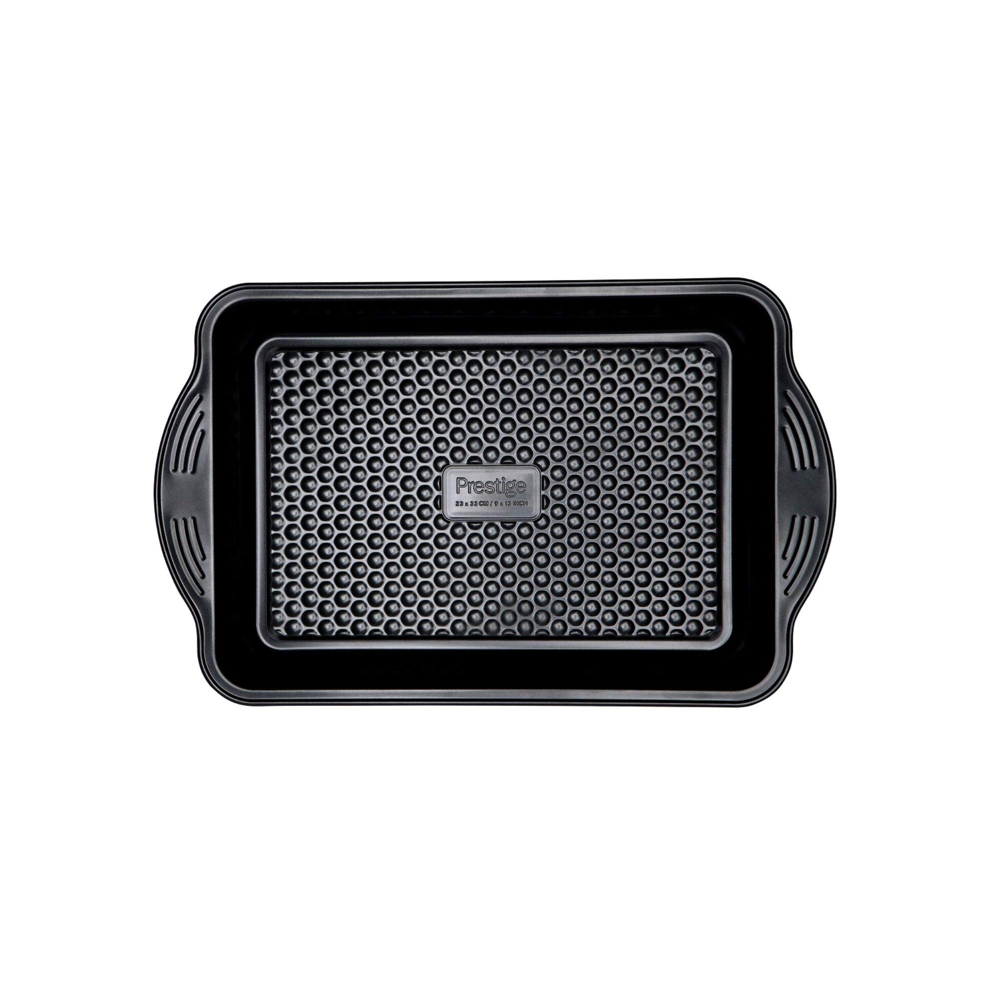 Prestige Aerolift 9"x13" Medium Roast & Bake Tray:This non stick roasting tray comes with a innovative cushioned base non stick to help you release your roast potatoes or chips easily from the tray and avoid any disaster during your baking. As it is non stick will also be very easy to clean and save you time.From roast chicken to roast potatoes, you can create a whole meal with this oven roasting tray non stick and keep the leftovers fresh as it is fully freezer and fridge safe. Once you have completed your masterpiece, feel free to put this non stick roasting tray straight in the dishwasher. Spend less time cleaning up and more time enjoying your roasts with family and friends. The extra large handles will help you to be extra safe with maximum control.Prestige Aerolift heavy duty roasting tray is made of ultra durable carbon steel and will last for years to come. We also have added a 5 year guarantee for complete peace of mind.Main Benefits: Ultra durable carbon steel Non stick cushioned base Fridge and freezer safe Dishwasher safe Extra large handles 5 year guarantee Internal measurements: 33 x 23 x 5 cm External measurements: 41 x 25 x 5 cm