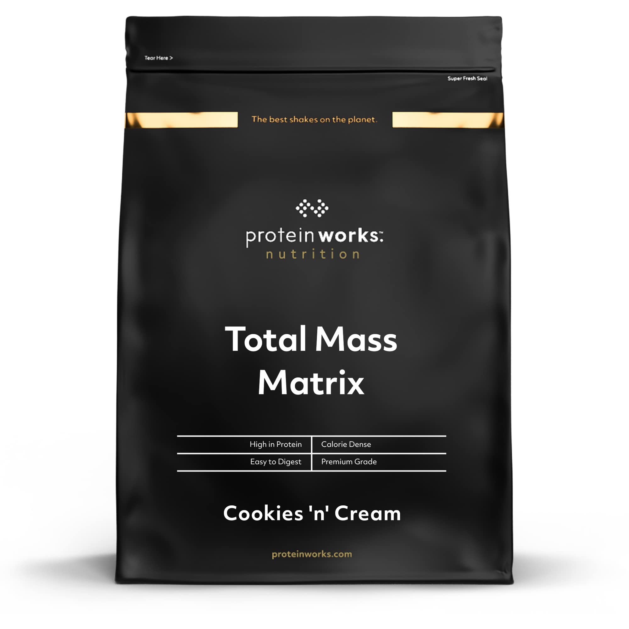 Product DescriptionThe definitive weight gainer for anyone looking to increase their calorie intake.Packed with 477 kcals, 31g of protein & 63g of carbs per serving, Total Mass Matrix is designed for anyone looking to bulk up and increase muscle mass.Engineered with an optimal 2:1 carb to protein ratio, this cutting-edge formula is tailored to your body's recovery demands. It also incorporates MCTs to provide an exceptional quality of healthy dietary fats necessary for general health maintenance.IngredientsCarbohydrate Blend (OAT Flour, Maltodextrin, Dextrose Monohydrate) Protein Blend (Whey Protein concentrate (MILK), SOYA Protein Isolate) Golden Flaxseed Fat-Reduced Cocoa Powder Flavouring Medium Chain Tri-Glycerides [MCT, Sodium Caseinate (MILK), Glucose Syrup Solids, Emulsifiers: E472c] Stabiliser (Xanthan Gum) Salt Sweetener (Sucralose)Directions600 - 700ml of chilled water or milk.Add 3 grey scoops (120g) Shake well for 10 secs & drinkManufacturer Contact InformationProtein Works™, Unit 5 Pembroke Court, Cheshire, WA7 1TG, UK