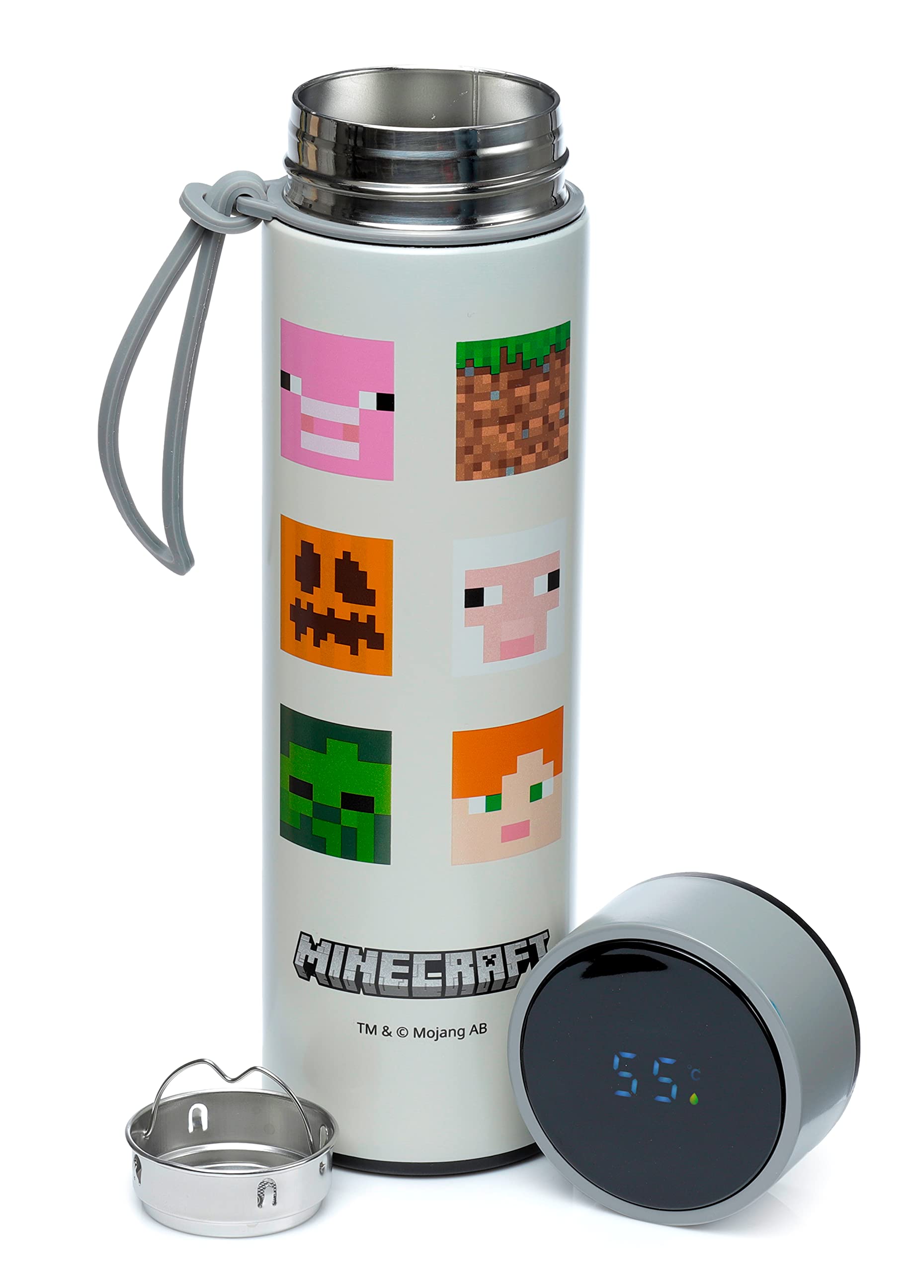 Product Description Minecraft Faces Reusable Stainless Steel Hot & Cold Thermal Insulated Drinks Bottle Digital Thermometer 450ml Material: Stainless Steel, Polypropylene and Silicone Food Safe: Yes Dishwasher Safe: No Reusable: Yes Volume: 450ml BPA Free: Yes Digital Temperature Display: Touch the top with your finger to give a digital readout of the temperature inside. The battery inside the lid is a fixed unit that is not replaceable, however it will last for approximately 300000 uses. Product Information: Suitable for hot and cold drinks. Keeps liquids cold for up to 24 hours or warm for up to 6 hours. There is a removable tea strainer that sits in the top for loose tea leaves. Also comes with a handy strap. Product Resources: Want to find out more about purchasing from Puckator? Then read our customer information guide. Need more information on water bottles and flasks? Visit our resource centre and browse our water bottles and flasks product buying guide full of useful tips and information on purchasing and selling our products. Product Attributes More Information Dimensions Height 23cm Width 6.5cm Depth 6.5cm EAN Barcode 5055071778124 Carton Quantity 24 Weight (kg) 0.338000