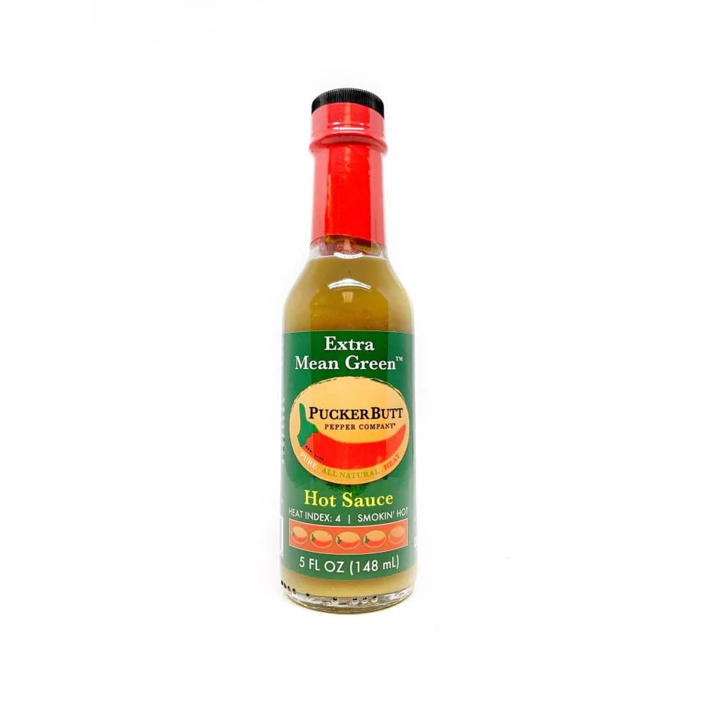 PuckerButt Extra Mean Green Hot Sauce (5oz) - This smooth, but intense Ghost pepper blend is infused with ramps (wild leeks) from the North Carolina mountains and cut with early season herbs. It's green and the kick is "hillbilly mean!"