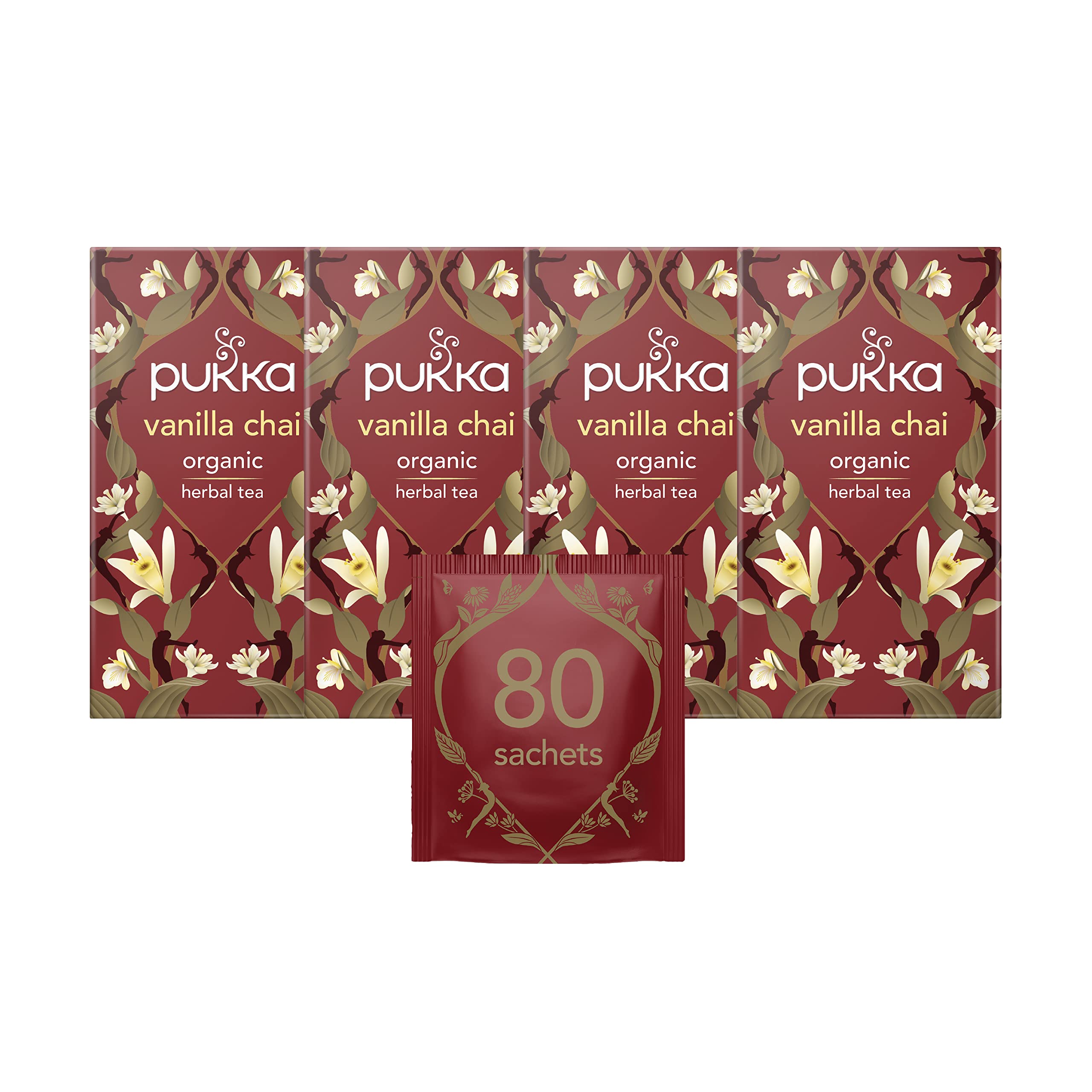 DescriptionProduct DescriptionNestle into the warm embrace of our expertly crafted Vanilla Chai tea. Balancing the comforting spices of cardamom and ginger with the indulgent richness of cinnamon and vanilla, our chai blend offers a symphony of flavours that will entice your senses and soothe your soul. With each sip, you will be surrounded by the aromatic aroma of spices and vanilla whilst indulging in life's simple pleasures. Our in-house herbal experts and nutritionists have crafted this tea using the highest quality ingredients to bring you the finest cosy flavours nature has to offer. Whether you're taking a moment to yourself or sharing a cup with loved ones, this tea will infuse your day with warmth, comfort, and happiness. At Pukka Herbs, we are proud to bring you the finest blends of organic herbs, sustainably and ethically sourced from around the world. Our cinnamon, a key ingredient in our cosy range, is sourced from a certified fair-trade project in the hills of north Vietnam. At harvesting time, the valuable inner bark is peeled off and sun-dried, where it naturally curls into cinnamon quills. The harvested cinnamon is then tested for its essential oil content to guarantee the highest quality flavours in every cup of tea. Each tea bag is nestled in a FSC® certified paper sachet, ensuring the flavour and quality of the tea is protected until you're ready to enjoy. Join us on a journey of discovery with each sip of our delicious herbal tea.IngredientsCinnamon bark (40%), ginger root, licorice root, cardamom pod, fennel seed, vanilla pod (4%).DirectionsInfuse for up to 15 minutesSafety WarningStore in dry place away from direct sunlight below 30°CManufacturer Contact InformationFreepost PUKKA HERBS; Email: hello.uk@pukkaherbs.com