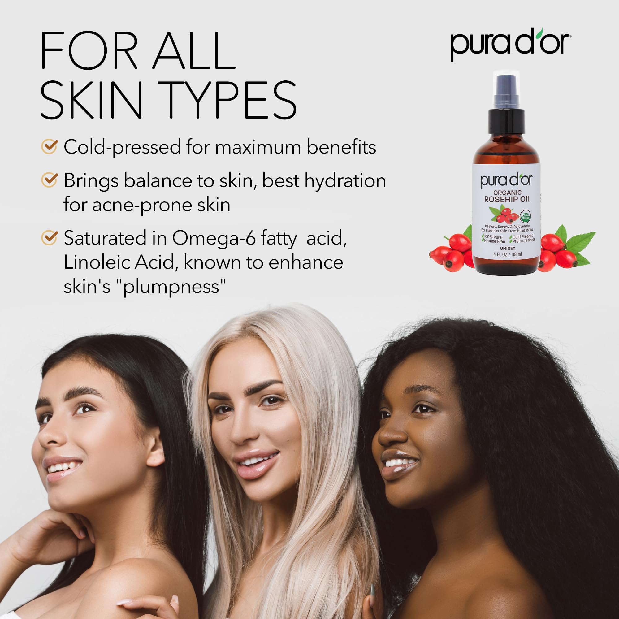 Extracted from the seeds of Rosa Canina in Chile, PURA D’OR Pure Organic Rosehip Seed Oil is rich in vitamins and antioxidant minerals that help improve the skin’s appearance and health by keeping it hydrated, stimulating regeneration of damaged skin, delaying visible signs of aging, and balancing natural moisture within the skin. Rose hip seed oil organic can be used as a face moisturizer, body or neck. PURA D’OR Pure Unrefined Rosehips Oil also works as a spot and scar remover. It helps you achieve a healthier, brighter skin without the help of harmful agents like parabens and sulfates because it is pure and organic.