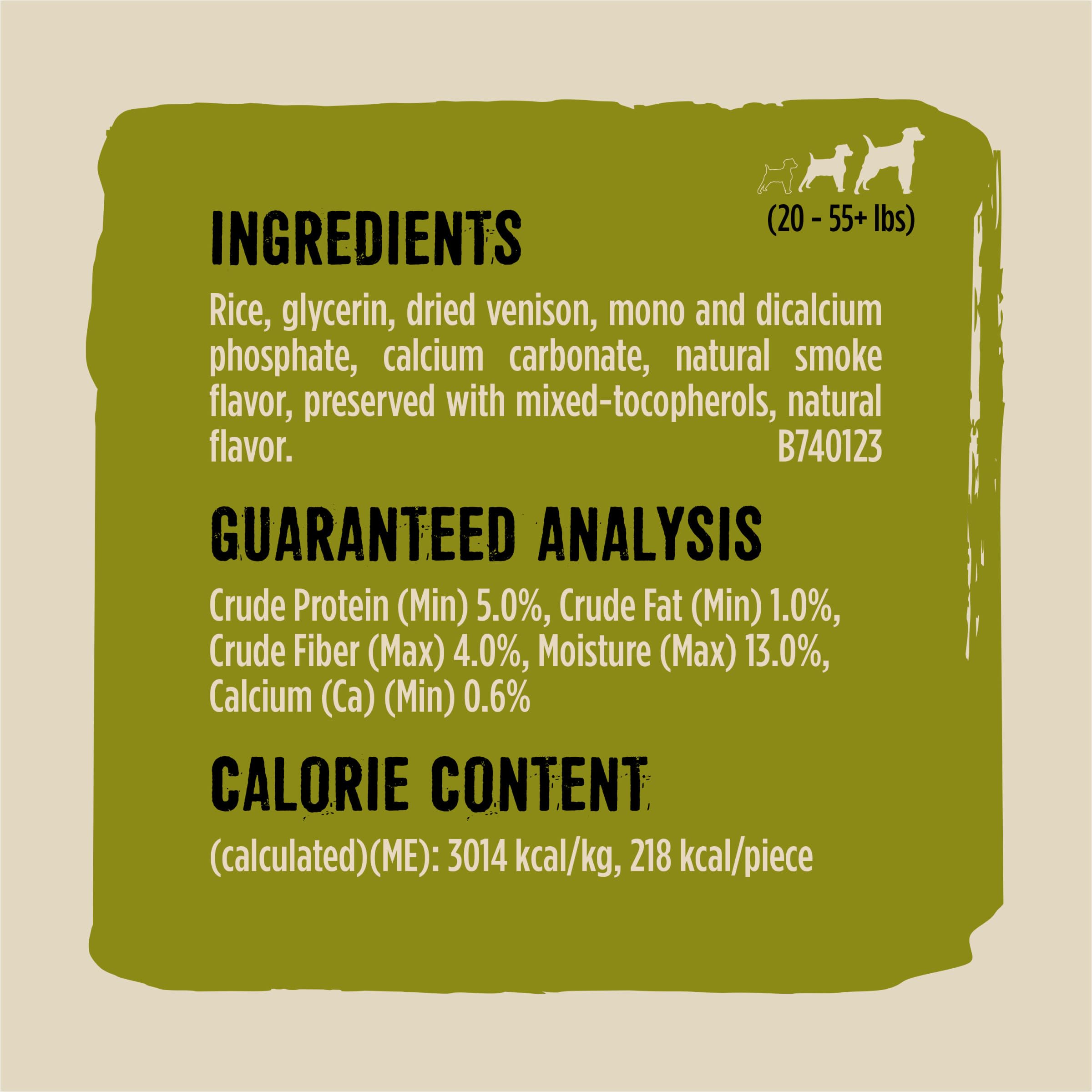 Satisfy your dog's instinctual love of chewing with Purina Prime Bones Chew Stick With Wild Venison medium dog bones. These extra-long-lasting, natural dog treats with added calcium are rawhide free and provide a safe and naturally edible treat that your dog is sure to love. Each of these rawhide free dog chews provides extra-long-lasting enjoyment with an antler-shaped chew to keep him entertained and thinking about his next big adventure in the wild. With big, untamed flavor, these limited ingredient dog treats are just the right size for your dog to chew, giving him an extra-long-lasting dog chew that helps clean his teeth, too.