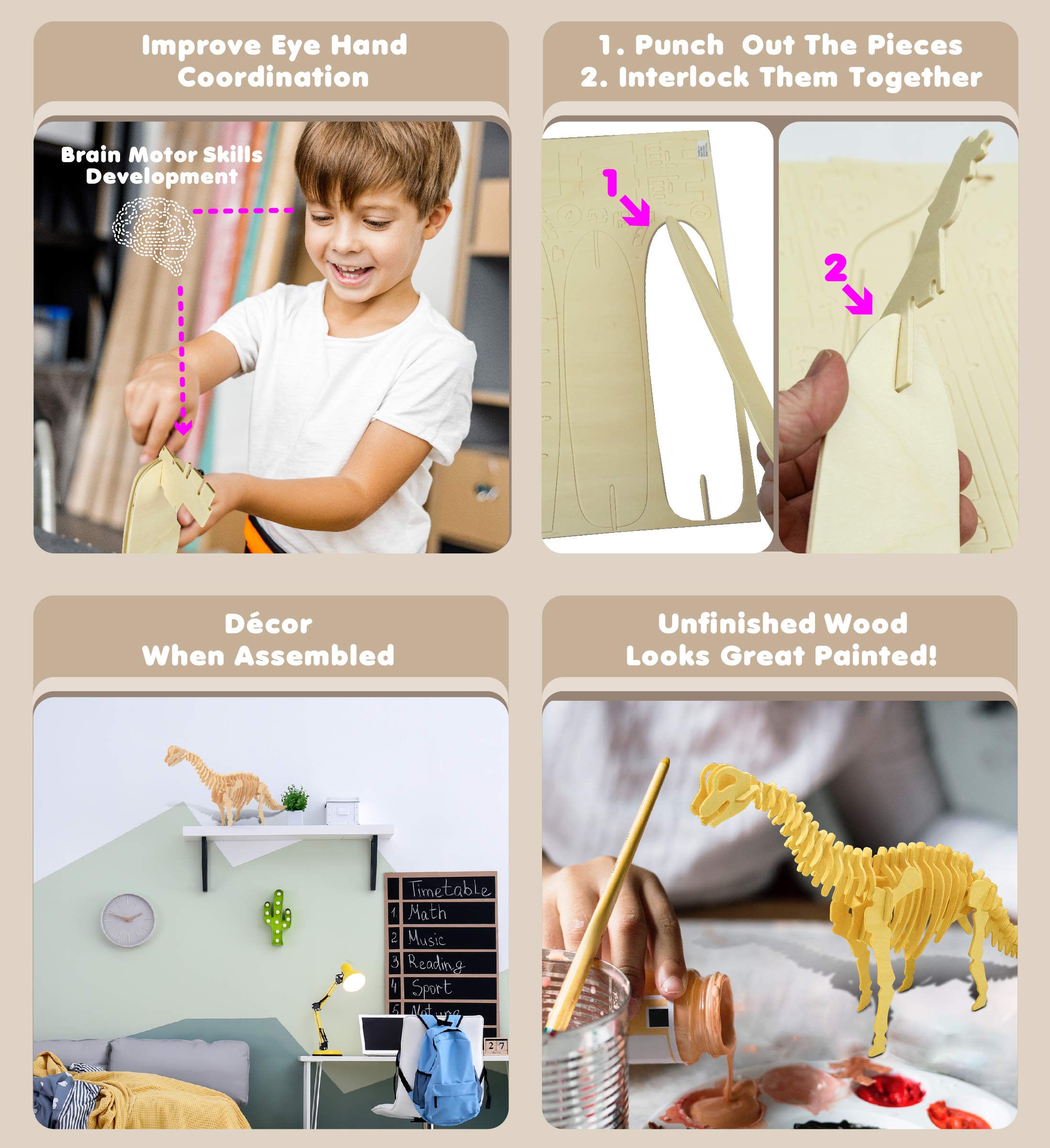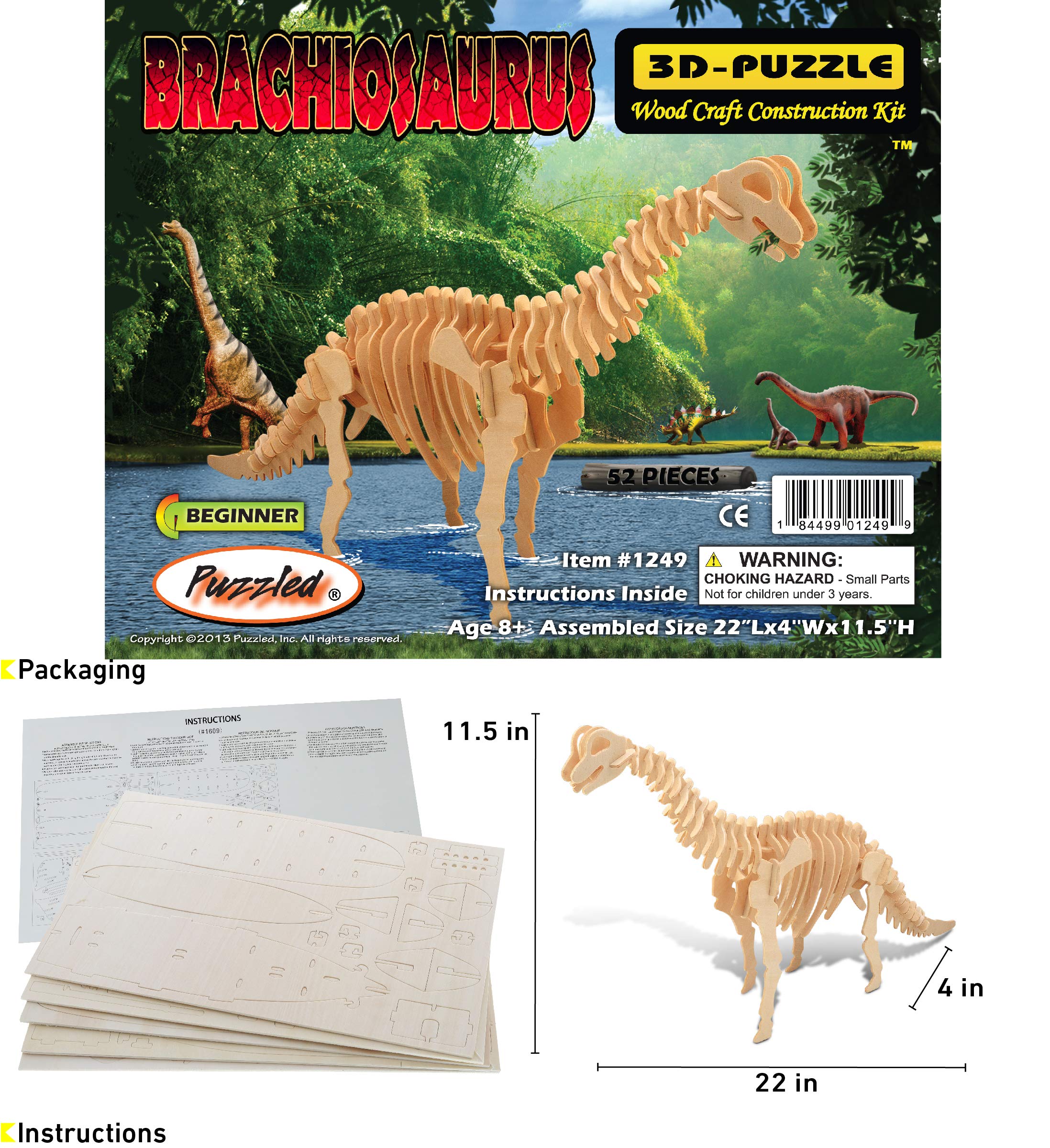 Challenge yourself & loved ones to build DIY 3-D puzzles & display your achievement as artwork or play with your new model toy. The Brachiosaurus puzzle can be customized to make it fit any theme. 3D puzzles help develop a child's skills such as problem-solving, shape recognition & patience. Playing with puzzles encourages kids to become creative & productive. Once assembled, your little one can play with the dinosaur puzzle as their new toy. Perfect indoor brain teaser games for children & a fun challenge for adults who love DIY projects and crafting. Building the Brachiosaurus model figure makes a fun educational bonding activity for parents & their little ones. Hobbyists & collectors will be excited to take on a new challenge and assemble the puzzle as fast as they can! Ideal for kids, boys and girls, who love solving different kinds of puzzles. Suitable for kids age 8 & up. Includes 1 Puzzled Brachiosaurus 3D Puzzle Wood Craft Construction Kit with 52 interlocking puzzle pieces. The Brachiosaurus figure features realistic and intricate details such as its characteristic long tail & neck, and its tiny head. No need to use glue! All pieces are interlocking and will remain sturdy once the puzzle is perfectly assembled. Puzzle kit comes with an instruction manual. Brachiosaurus dinosaur 3D puzzle is made from premium quality wood & durable materials. All puzzle pieces are laser cut & sanded thoroughly to ensure smoothness of edges. Colored with a natural wood COLOR which can be painted for a more personalized look. Each piece of this dinosaur 3d wooden model kit can be painted individually, giving the Brachiosaurus model a very realistic look, making the extinct creature come to life again! Puzzled's 3D Wooden Puzzle will surely bring a smile to your loved ones as they recall the fun memories they had while building the challenging educational toy. Fully assembled, the Brachiosaurus 3D puzzle will stand on its own in an strinking pose, measuring 22''Lx4''Wx11.5''H.