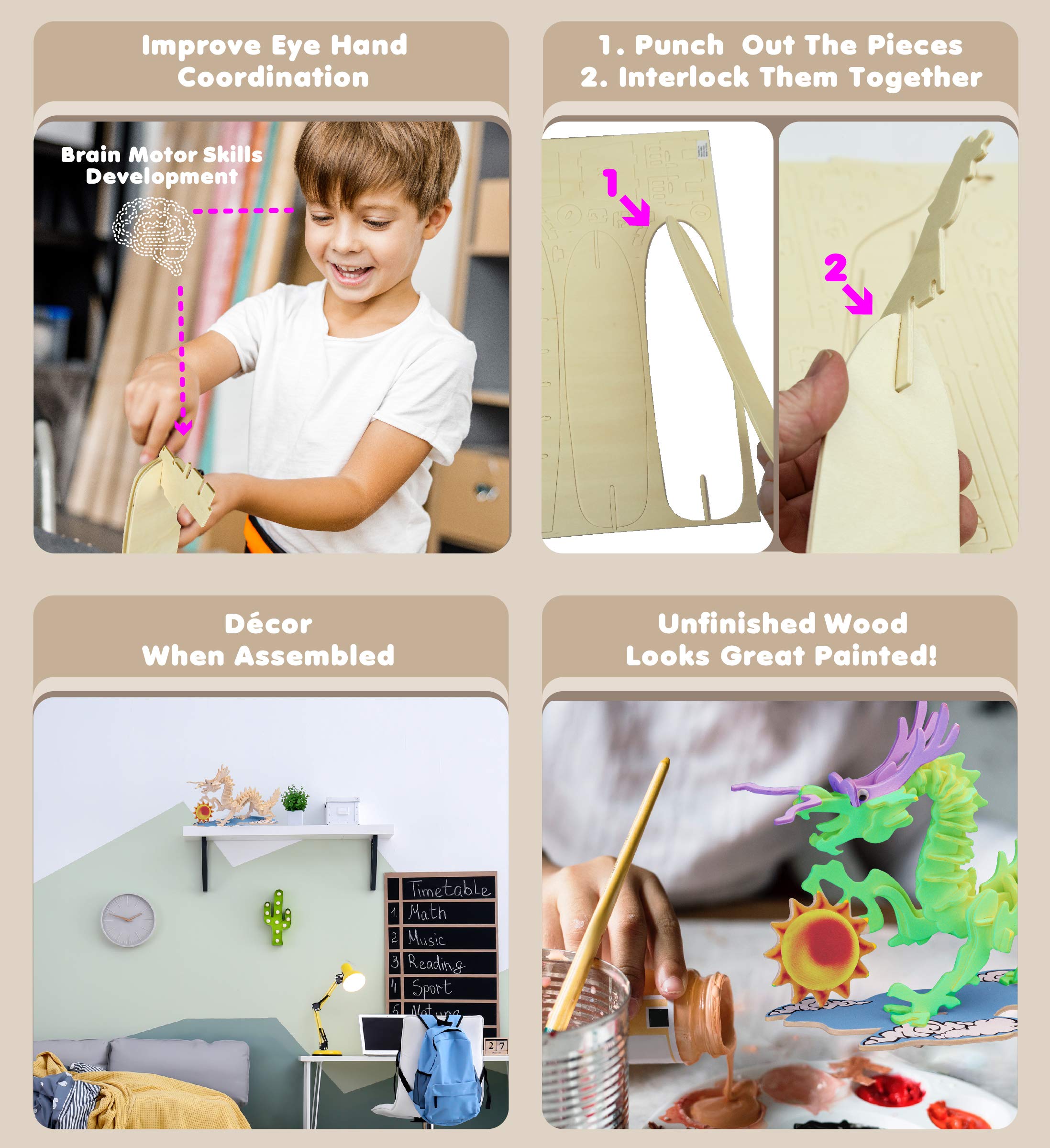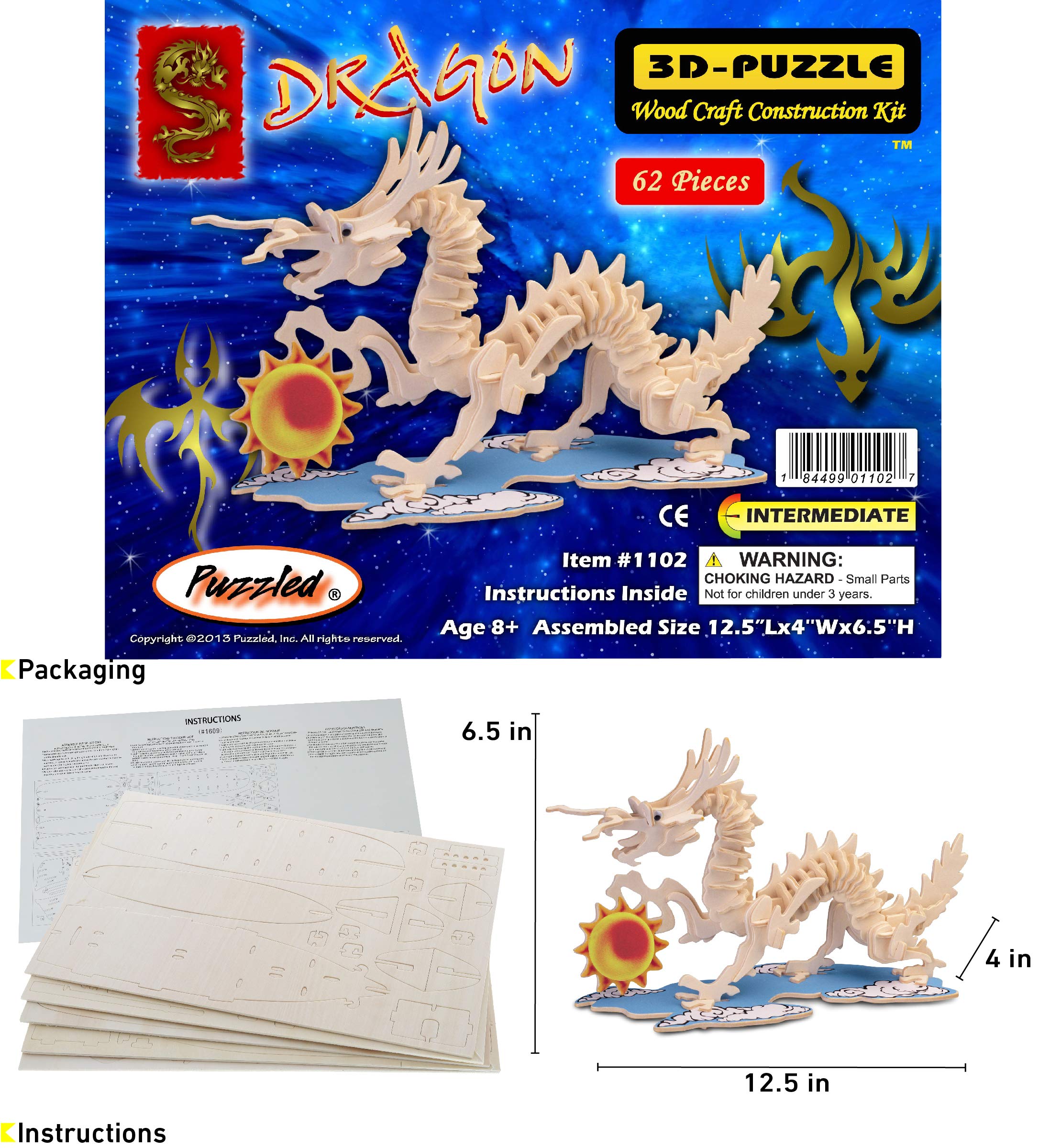 1102 - 3D puzzles Dragon SM - the Dragon 3D wooden puzzle is a challenging and creative toy made of high grade 3mm natural wood and comes in a shrink-wrapped package with instructions and sandpaper included. This fine Dragon is part of our fantasy & Asian theme collection, just match the numbers together 1 with 1, 2 with 2 and so on. After assembly you can paint, play, display or disassemble and enjoy the challenge of building again. Our 3D puzzles collection is a great educational tool and pass time for you and your family. Suitable for all ages simply pop out the pieces and go. Start your collection today. This carefully crafted product is brought to you by Puzzled Inc.