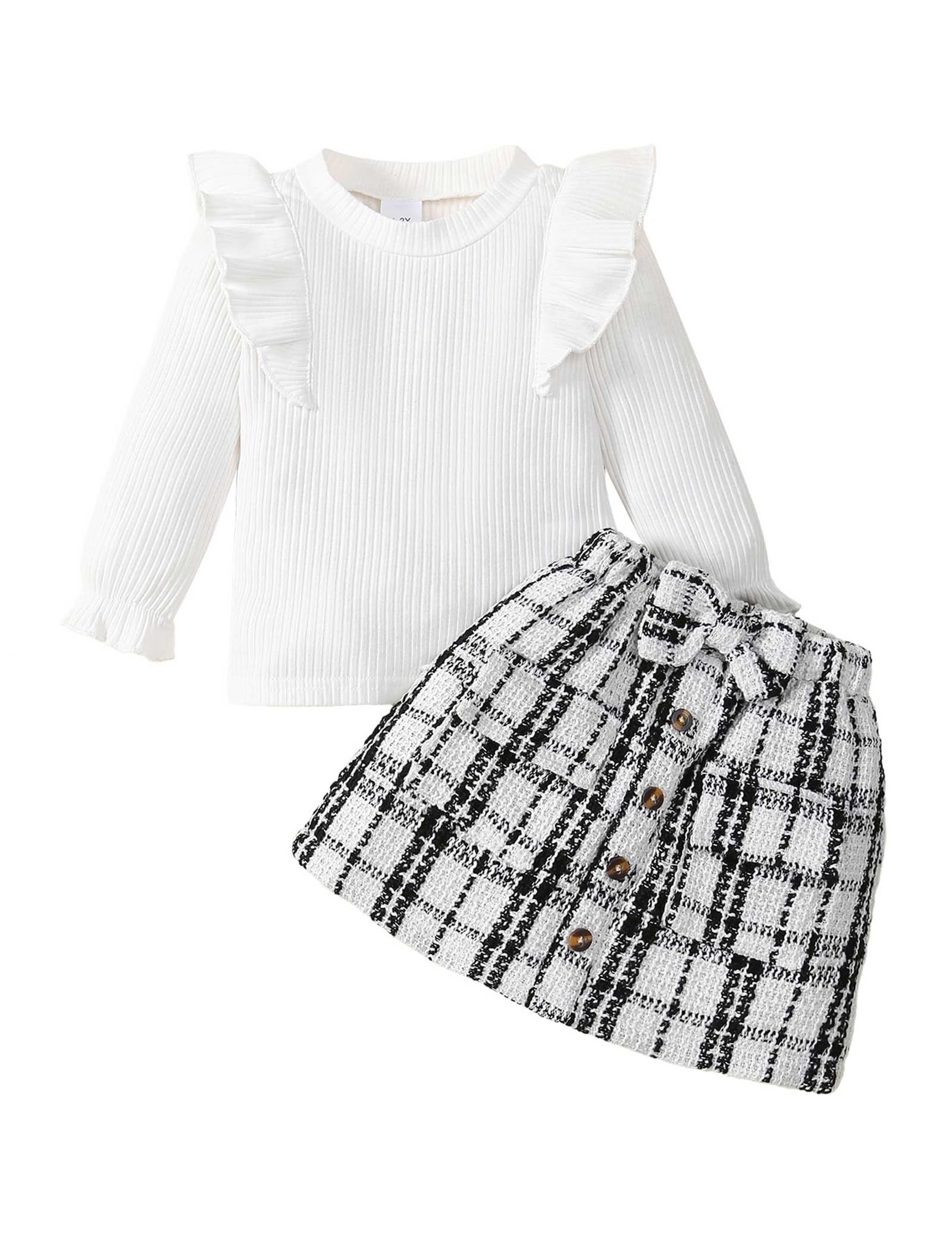 Top shirt is long sleeve, ribbed and has ruffles along shoulders