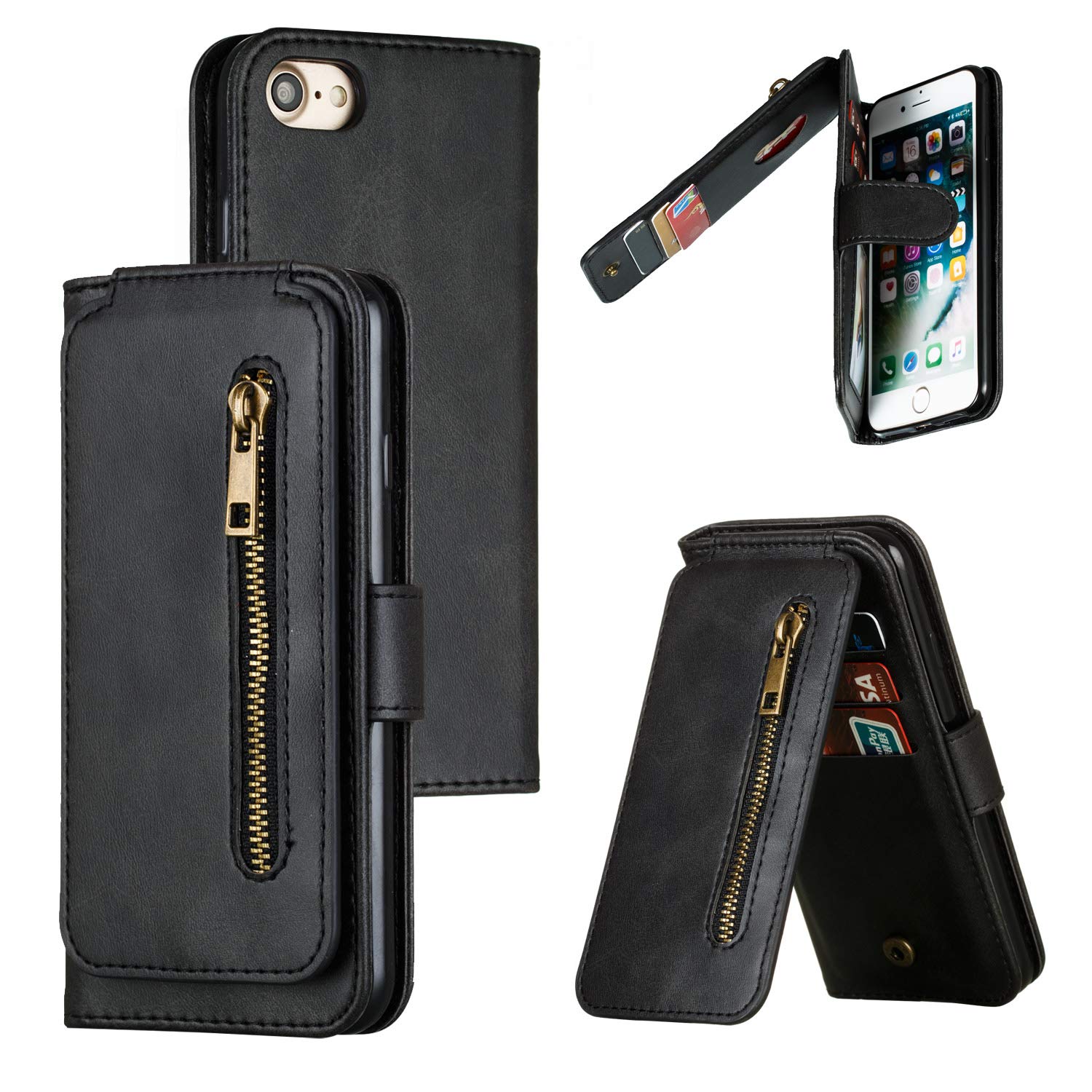 QLTYPRI Case for iPhone 7 Plus 8 Plus, Wallet Case with Premium PU Leather Zipper Purse Credit Card Holder Slot Kickstand Wrist Strap Dual Layer Protective Case for iPhone 7 Plus 8 Plus - Black