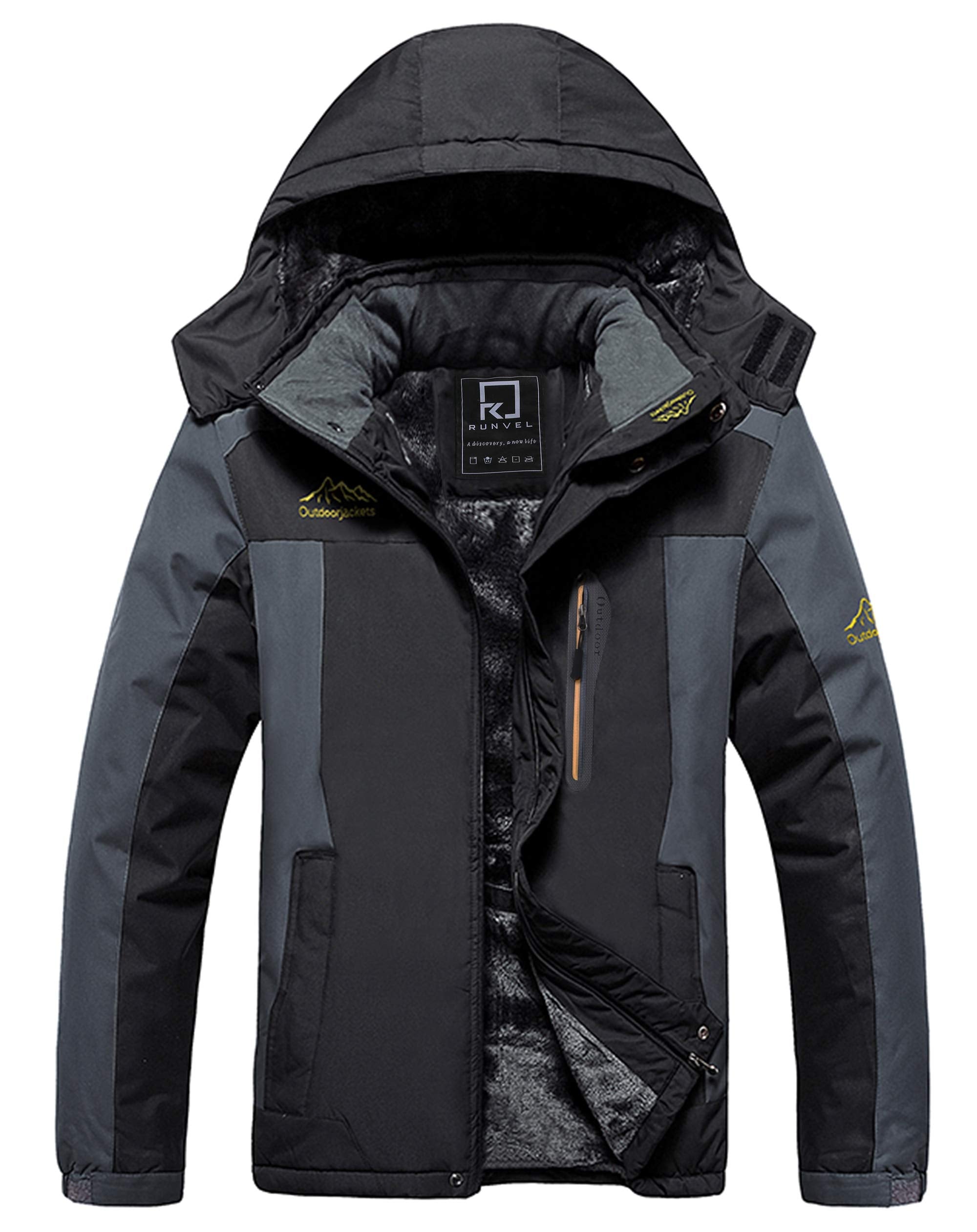 R RUNVEL Mens Waterproof Coats Winter Jacket Fleece Hiking Ski Rain Warm Outdoor Walking Mountain Thermal Jackets with Hood Black UK M