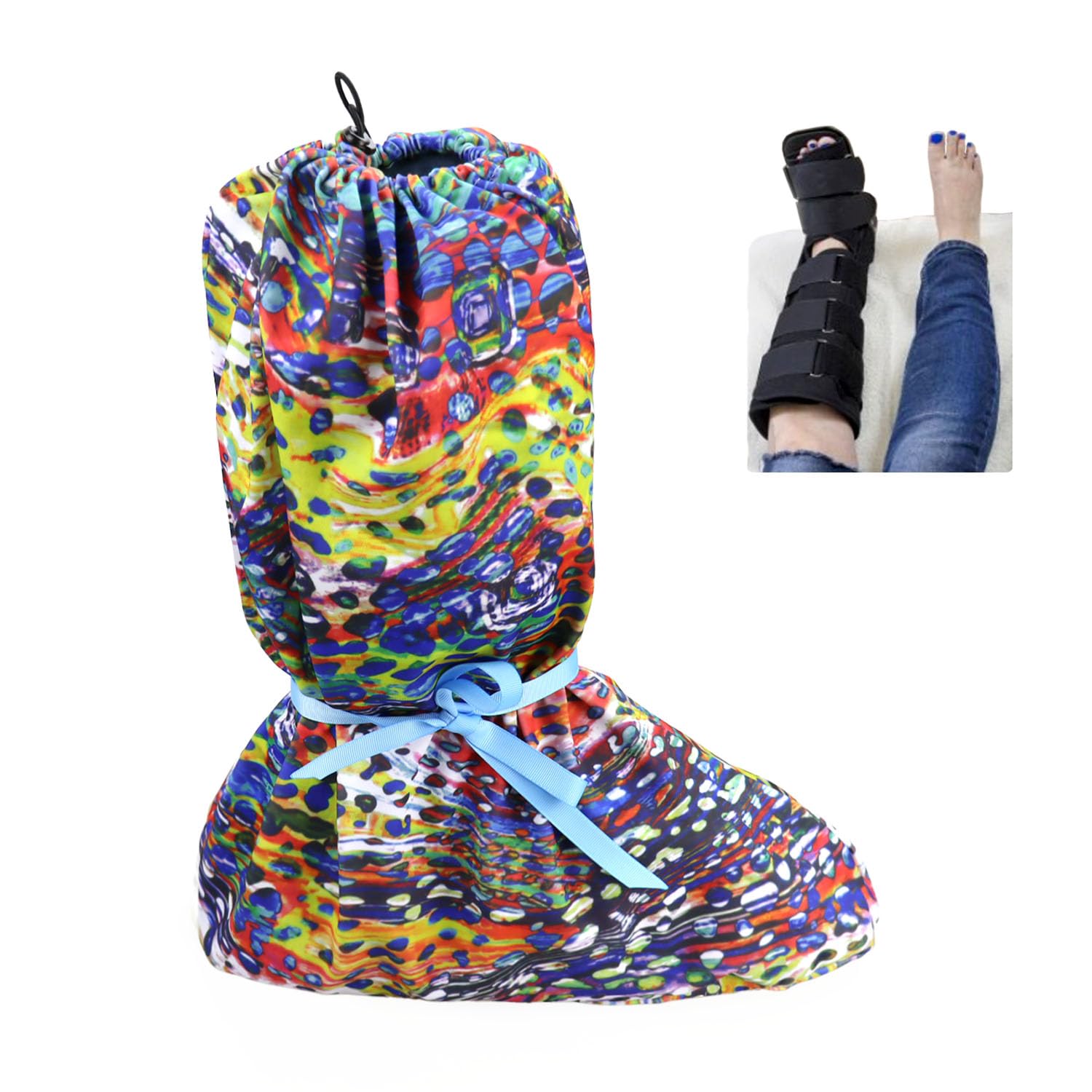 Covers to enclose your medical walking boot while in bed. Made of elastic swimsuit material to help with smooth movement under the sheets. It fully encloses your boot to keep the day's dirt on your boot out of your bed.