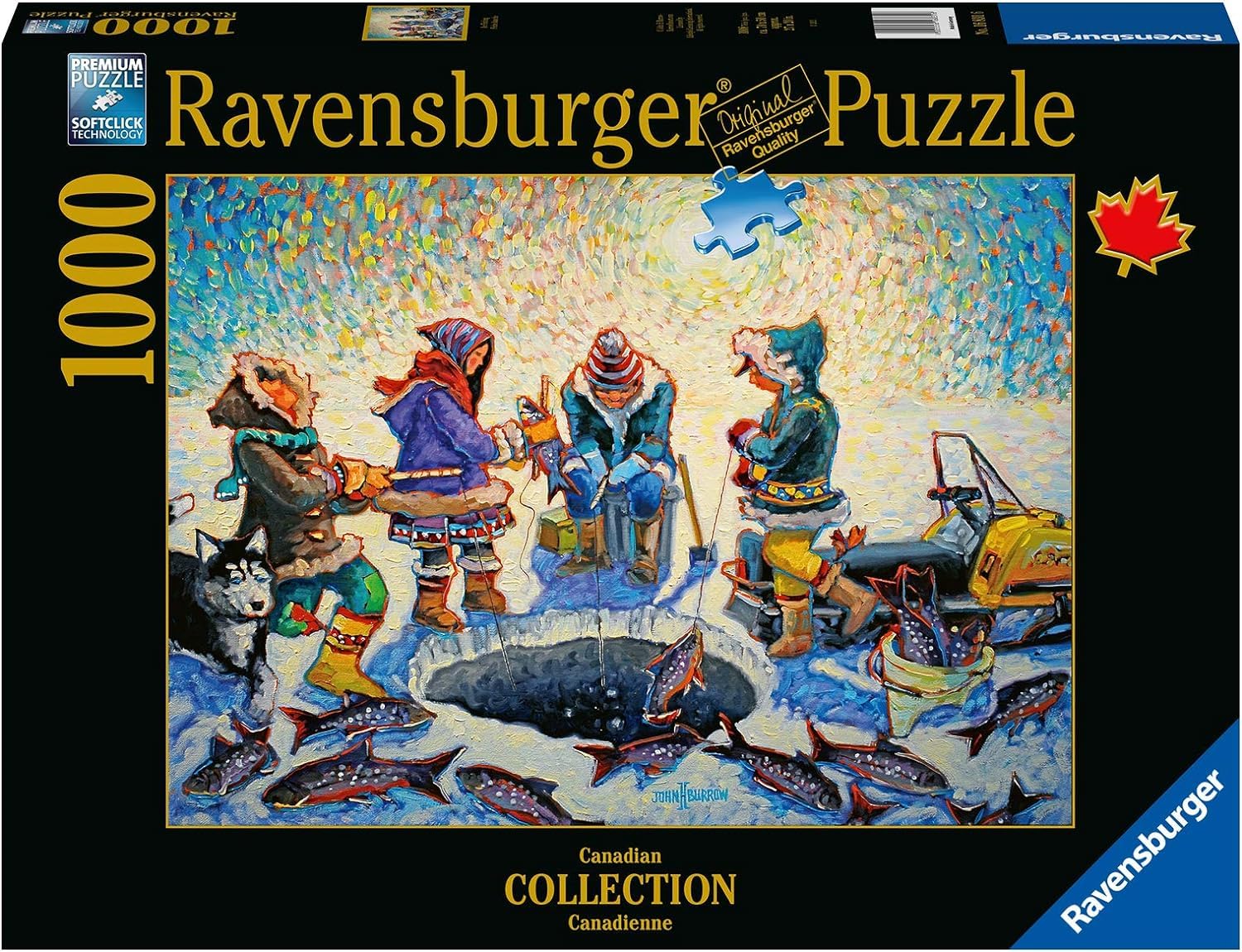 The fish are biting in this time-honored winter scene! Ice fishing has provided both sport and food during the long, cold winter months for millennia. Indigenous people of northern Canada used tools like axes to chip holes in the ice, then dangled hand-carved wooden fish to lure fish to the hole. In our more modern scene, a trusty snowmobile is ready to whisk these anglers home after the catch. A perfect puzzle for any outdoor enthusiast! Part of our Canadian Collection series, this 1,000-piece jigsaw puzzle combines captivating imagery with clean-cut pieces and Ravensburger’s perfect interlocking fit for a most pleasurable puzzling experience. Create memorable moments with Ravensburger premium puzzles! About the Artist: John H. Burrow is an artist residing in the Shuswap Lake area of British Columbia, Canada. He shares his love of nature with others through his work. John’s oil paintings are always bright, full of color and imbued with a sense of joy and playfulness. The Canadian landscape and “Group of Seven” school of painting are sources of inspiration. He frequently paints outdoors in a free, fluid style. John’s work is collected by both corporate and private collectors all over the world. Finished puzzle measures approximately 27 x 20 inches (70 x 50 cm) when completed.