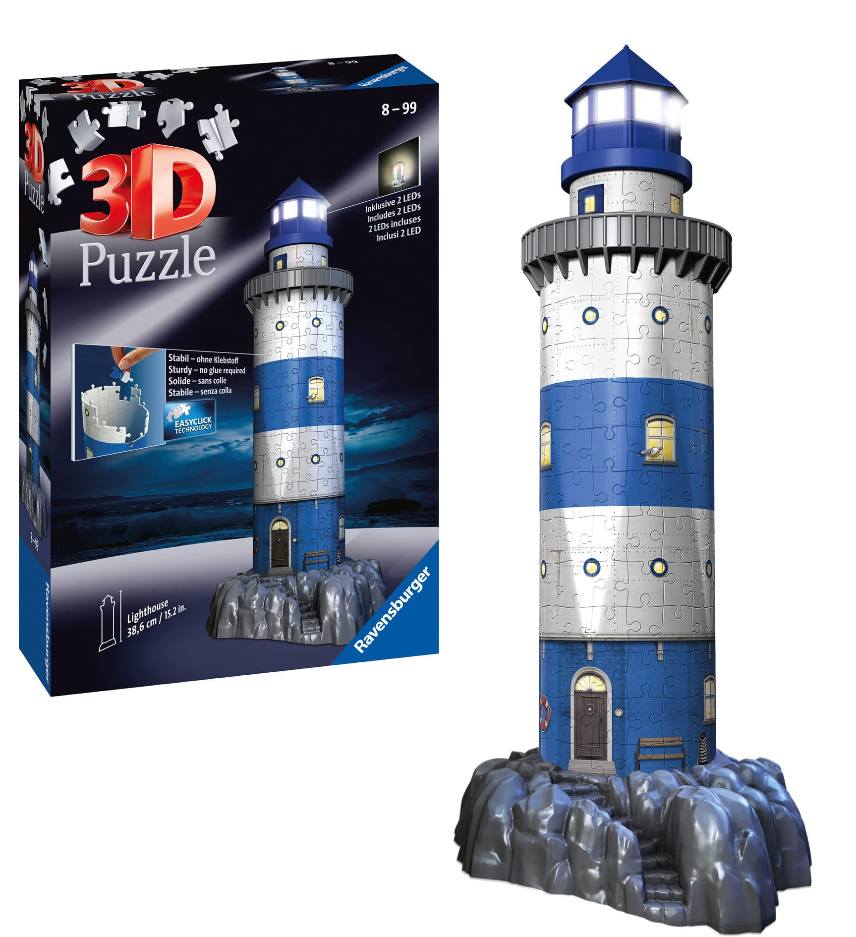 Product DescriptionUtilising the latest 3D puzzle technology you can create this stunning 3D model of a Lighthouse. This "Night Edition" Lighthouse 3D puzzle uses LED technology to create the light beacon to warning passing ships and make this puzzle an effective and dramatic addition to any room. The puzzle uses unique hinged plastic pieces, which slot together to build a sturdy and strong building and best of all no glue is required! The puzzle has 216 high quality plastic pieces and 3 additional pieces to build this excellent model. Each puzzle piece is printed with a number on the reverse side, so you can either assemble the puzzle by eye, or by following the numbers on the back. The puzzle comes with a plastic base, so it can be displayed on a shelf or table top. This model makes and ideal room decoration that you can build on your own or as a family. Collect all our 3D puzzles and create your own city Skyline! High quality 216 piece plastic jigsaw puzzle. The finished puzzle measures 40cm high when complete. Suitable for ages 10 years and up.Safety WarningWarning! Not suitable for children under 36 months due to small parts which pose a choking hazardLegal DisclaimerNon adatto a bambini sotto i 3 anni di etc. Nonostante sia nostro impegno assicurare la correttezza delle informazioni dei prodotti talvolta i produttori possono modificare le loro specifiche. L'imballaggio effettivo utilizzato e i materiali possono contenere informazioni che differiscono da quelle presentate nel nostro sito web. Si consiglia di non basarsi solo sulle informazioni qui presentate ma di leggere sempre le etichette, gli avvertimenti e i consigli d'uso prima di utilizzare o scartare un prodotto. Si suggerisce di contattare il produttore per avere maggiori informazioni su un determinato articolo.Box Contains3D Puzzle 216 pieces