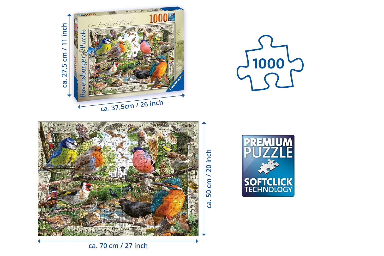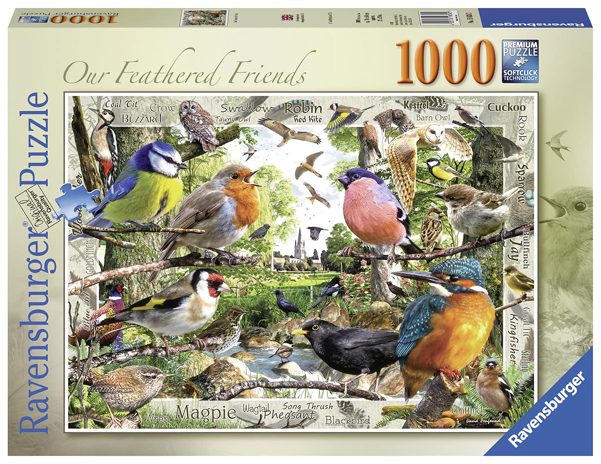Product DescriptionIf you enjoy feeding the birds in your own garden or go out bird watching, we’re sure you’ll recognize many of the feathered friends shown here. A Kingfisher, Goldfinch, Blue Tit, Robin and Bullfinch all vie for the “most colourful” award, watched over by the less obvious (but just as delightful) Wren, Sparrow, Blackbird, Greenfinch and Bullfinch. Many other birds flutter across the sky or are to be found amongst the undergrowth, whilst a distant church spire offers the most picturesque of rural focal points. Created by Hampshire-based artist David Penfound. Our 1000 piece jigsaws are crafted with premium quality and measure 70 x 50cm when complete. Great for Adults and ideal puzzles for Children 12 years old and up.Bestselling puzzle brand worldwide - With over 1 billion puzzles sold, our jigsaw puzzles make ideal gifts for women, great gifts for men and fit perfectly on our puzzle board. Our puzzles use an exclusive, extra-thick cardboard combined with our fine, linen structured paper to create a glare-free puzzle image and give you the best experience possible. Positively Puzzling - From fun family times together to long term health benefits and day-to-day mindful moments, there are so many positives about the humble Jigsaw! They make a great birthday gift or smashing Christmas gift.Set Contains:1 x Puzzle 1000 pieces