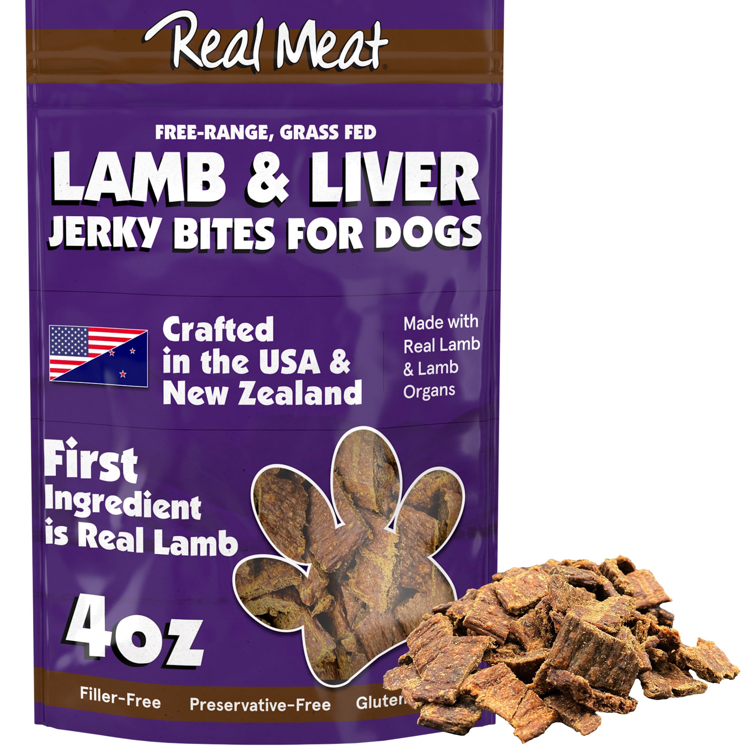 Get ready to unleash some serious tail-wagging, because The Real Meat Company is here to make your pup's snack time a feast fit for a king! Picture this: You're sitting on your couch and reach over for our real meat dog treats. The bag begins to crinkle and in flies your fur baby with their eyes and mouth wide open because they know something mouthwateringly delicious is about to happen. Why are our real meat lamb jerky dog treats the canine equivalent of a standing ovation? First of all, we're talking about 95% real, human-grade quality lamb & liver here! That's right, the kind of lamb that makes your dog feel like they are truly partaking in your family's steak dinner! Sourced from free-range, grass-fed sheep from New Zealand, our lamb is as high-quality as it gets. No hormones, antibiotics or any other artificial nonsense, just pure, unaltered meaty goodness. But wait, there's more! Our jerky dog treats are gently air-dried to paw-fection, locking in all of the nutrients and savory flavors. So, these aren't just empty calories. They're packed with naturally occurring Taurine, D3, A, and Vitamin B12, making them almost as nutrient-dense as a superfood but in meat form and way more tasty! Got a picky eater or a pup with a sensitive tummy? Looks like you've found your dog's new obsession! As with all of Real Meat's line of air-dried food and treats, these are grain-free and sugar-free, making them the perfect snack for any pup, from the tiniest Chihuahua to the most majestic Great Dane. And for those of you who like to keep the snack game interesting, we offer a variety of other drool-worthy recipes! Venison, beef, you name it-we've got other dog jerky treats your dog will backflip for. Why choose The Real Meat Company? Because we're not just another pet food brand. We're a family-owned business that puts pets first and is committed to quality, transparency, and overall, making pets and their humans happy. Our goal is to keep the tail-wagging and happy-dancing good times alive!