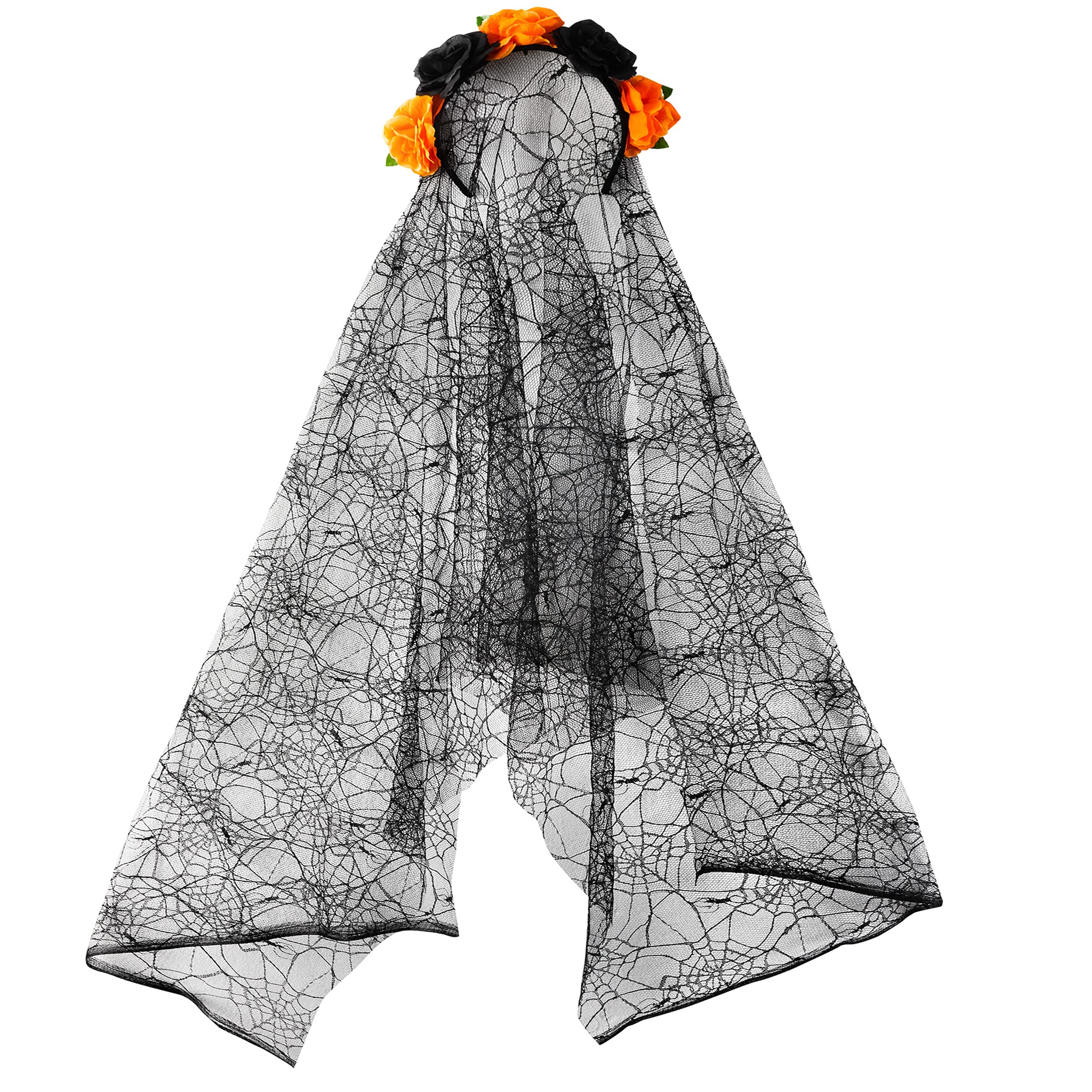 Ladies Day of the Dead headdress for Mexican carnival or halloween evening. Beautiful Orange and Black flowers with the long floral patterned veil. Adult Size