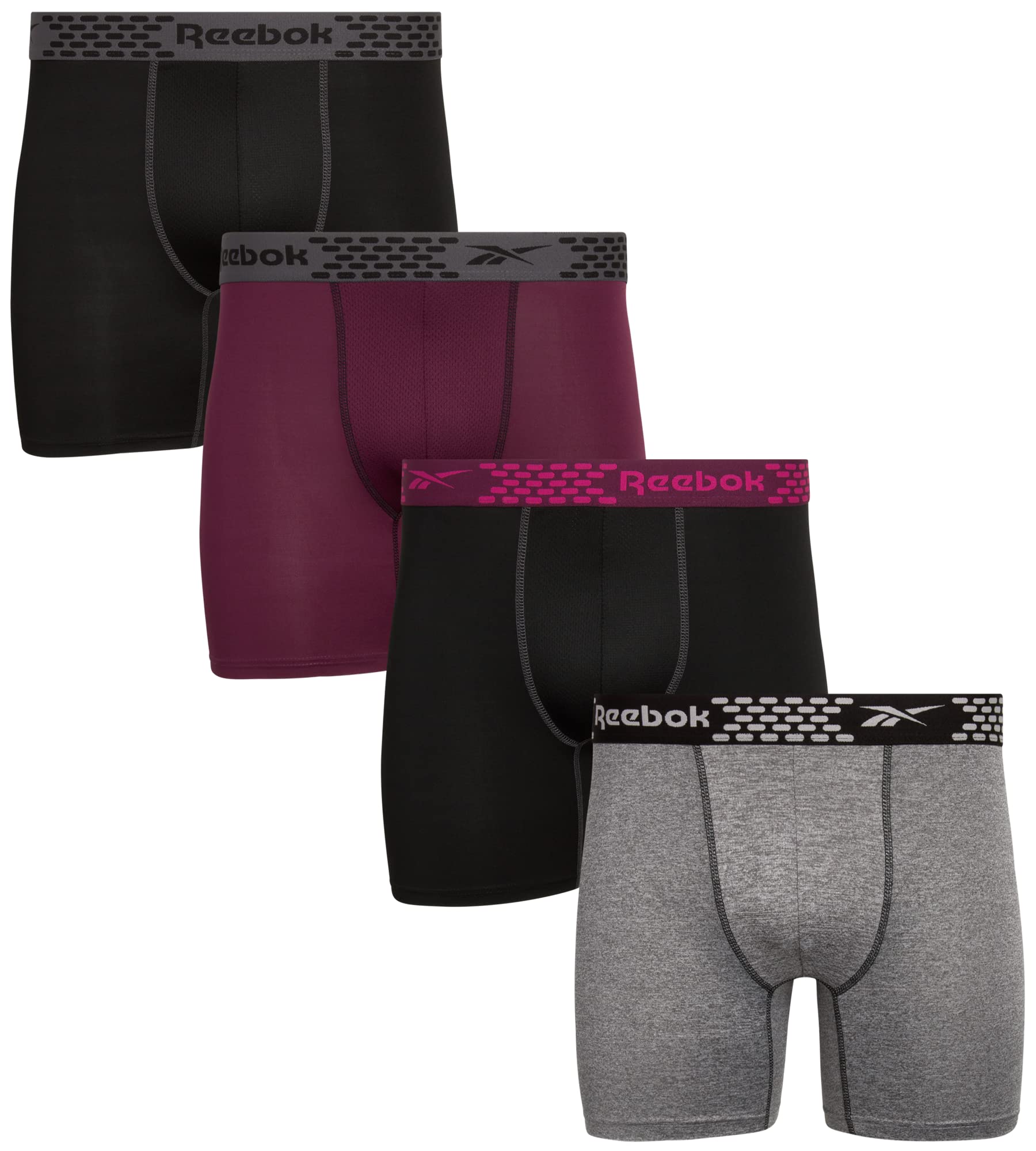 Reebok Men's Boxer Briefs - 4 Pack Quick Dry Moisture Wicking Performance Mens Underwear - Stretchy Soft Boxers for Men S-XL, Size X-Large, Black/Wine/Charcoal
