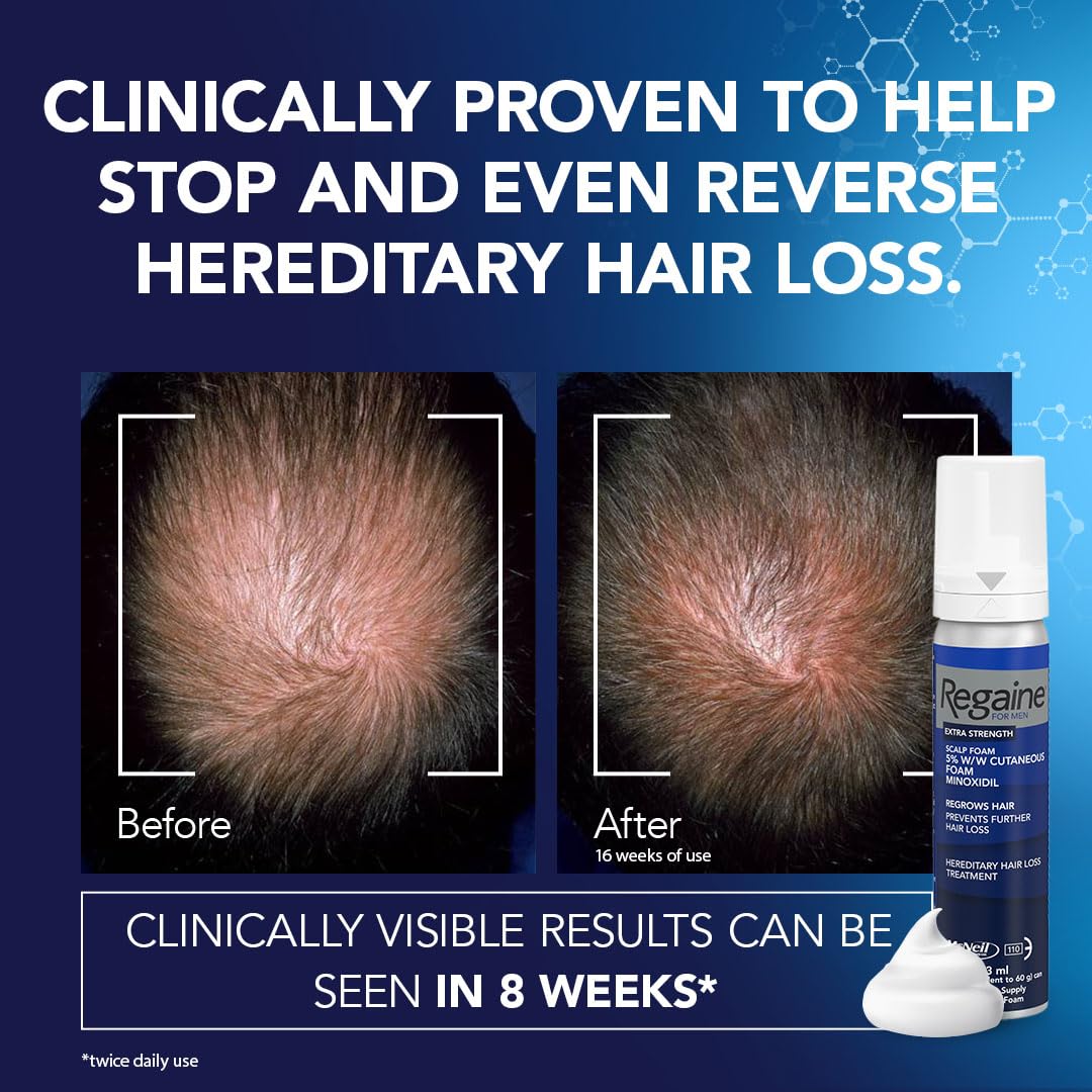 Regaine For Men Extra Strength Scalp Foam (3x 73 ml) - Treatment for male hair regrowthLooking to help halt or even reverse the effects of hereditary hair loss? With 40% of men showing noticeable hair loss by the age of 35, male pattern hair loss is a concern for many. Enter Regaine, an hair loss treatment for men. Thanks to the active ingredient minoxidil - the only OTC active ingredient proven to help regrow hair. It works from the follicle up, stimulating blood flow and encouraging new growth when used twice a day. 9/10 men said they kept or regrew hair after 16 weeks.Application instructions: For detailed directions for use see the leaflet enclosed with the product. Wash your hands thoroughly before applying. Ensure both the hair and scalp are completely dry before applying. Apply a 1g (1/2 a capful) dose to the total affected area twice a day. Massage the foam lightly into the affected areas of the scalp. Wash your hands thoroughly after applying the solution.Product Benefits at A Glance• Extra strength male hair regrowth foam• For men aged 18-49 experiencing hereditary hair loss• 5% minoxidil foam• Clinically proven to retain and regrow hair• 9/10 men said they kept or regrew hair after 16 week use• 3x 73ml bottleIngredientsMinoxodil 50mg/gDirectionsFor External Use OnlySafety Warning• Keep it away from eye contact. • Extremely flammable. • Pressurized container: May burst if heated. • Protect from sunlight and do not expose to temperatures above 50°C. • Do not pierce or burn, even after use. • Do not spray on a naked flame or any incandescent material. • Keep away from heat, hot surfaces, sparks, open flames and other ignition sources. No smoking. • Do not use near or place container on polished or painted surfaces. • Keep out of reach of children.Box Contains3 x REGAINE FOR MEN FOAM