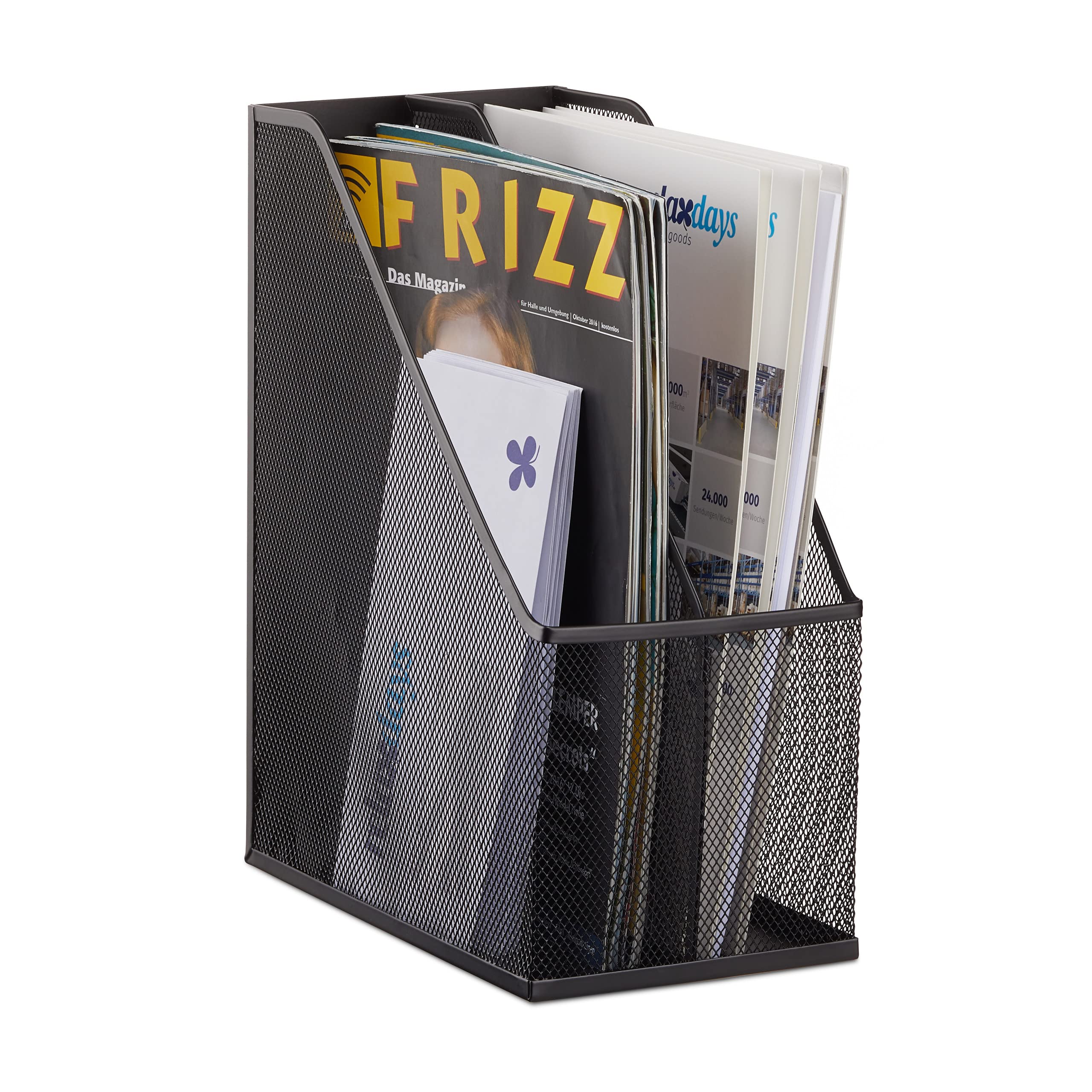 Product DescriptionYou can use this nifty file holder with 2 compartments for magazines, documents, sheets and notes and keep them orderly. The standing filing compartment is made of metal and makes for an ideal addition to your desk at home or at the office. A functional and straightforward design makes the metal mesh visually impressive. Metal Mesh File Holder with 2 Compartments • Size: H x W x D: app. 31.5 x 14.3 x 25 cm • Size per compartment: H x W x D: app. 31.5 x 6.5 x 25 cm • For formats between A4 and C4 • Made of metal • Weight: app. 1 kg Metal Magazine Rack • Ensures order on your desktop • Linear design (mesh) • Always have your notes, letters and documents in reach • 2 Separate compartments for order Included in Delivery • 1 x Standing File Holder with 2 Compartments • Decorative items shown in product photos are not includedBox Contains1 x Standing File Holder