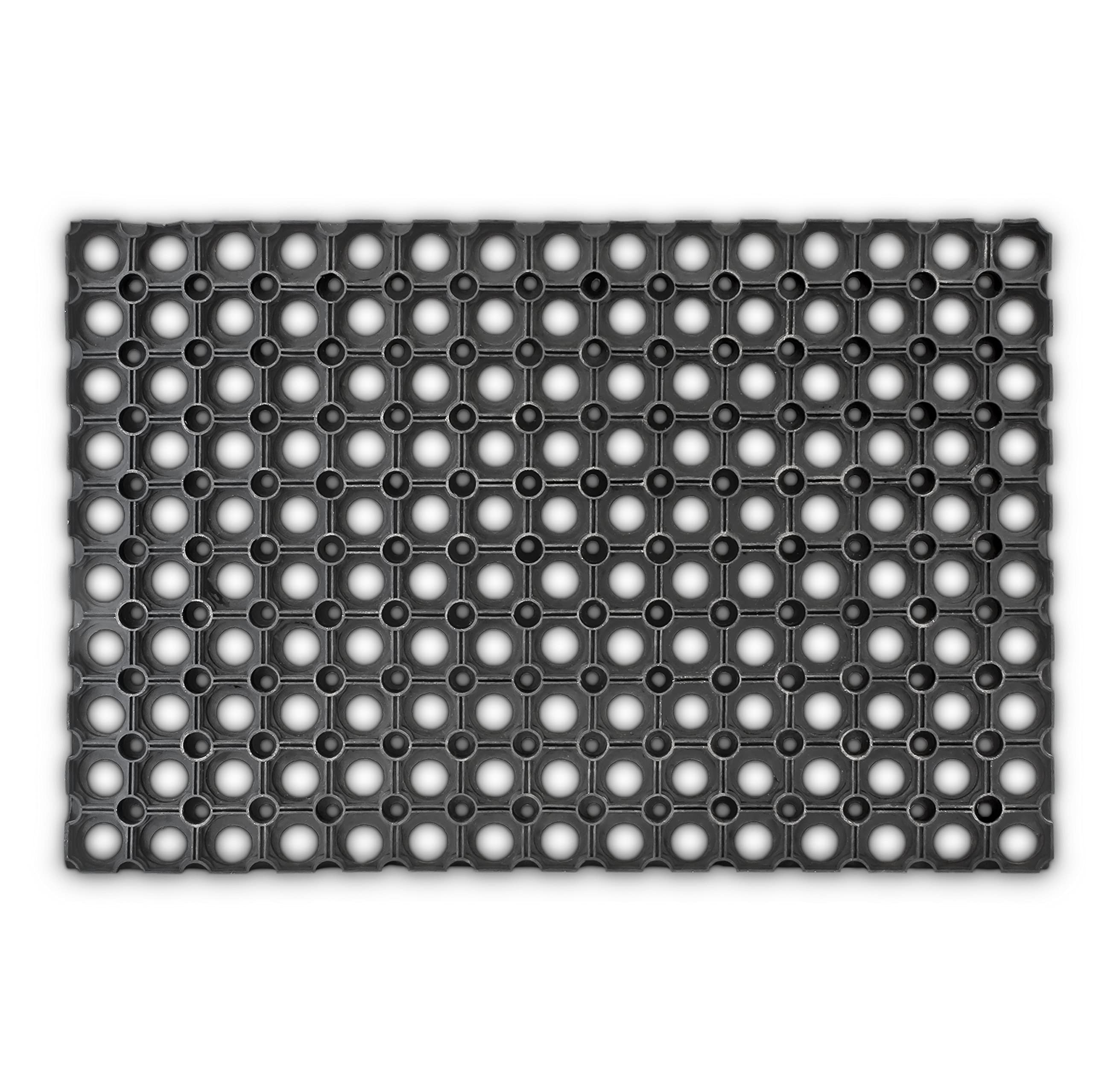 Product DescriptionThis rubber doormat is ideally suited for outdoor use, particularly for doorways with a lot of traffic. The rubber mat will catch the dirt off shoes but will not give it to the next person. Water runs out through the holes and if it gets very dirty, clean the mat by simply rinsing it with water.The rubber door mat is right for any little nook and can be cut to suit your needs with any conventional knife. This way, it can even be used in cramped areas or in your car.Details on the Rubber Doormat• Size: approx 1.5 x 60 x 40 cm (0.6 x 23.6 x 15.7 in)• Weight: approx 1.1 kg (3.1 lbs)• Colour: Black• Made of 100% rubber• Anti-slip and moisture-resistantRubber Mat for Indoor and Outdoor Use• Knobs catch all dirt• Water runs through• Rinse to clean• Suitable for any surface type• Can be cut to suit individual needsIncluded in Delivery• Rubber doormat• Decorative items shown in product pictures are not includedBox Contains1x doormat