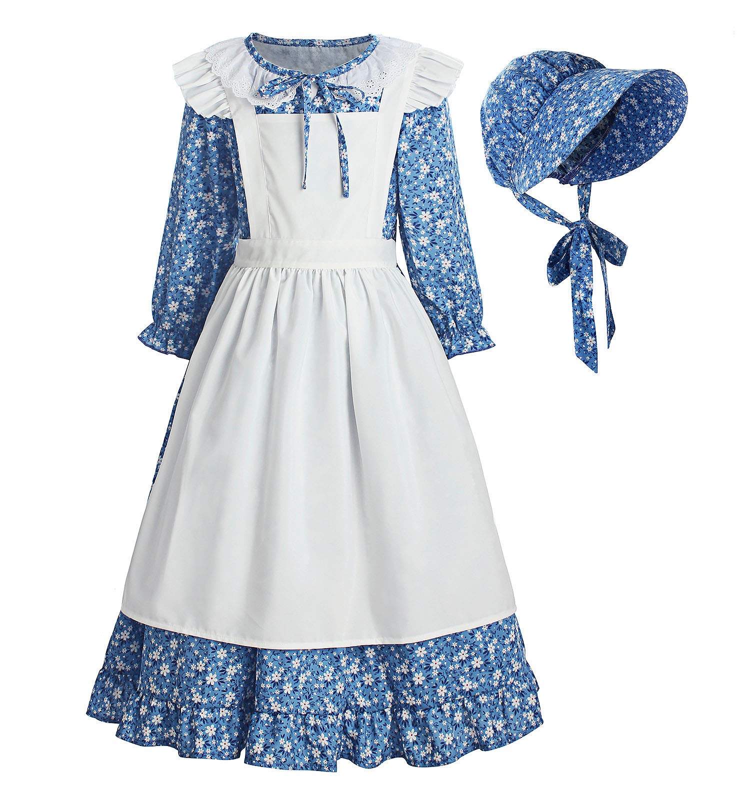 This costume is a 19th century dress worn by the adventurous pioneer girls of the American western frontier. It is perfect for your kids to play Laura in Little House on the Prairie and also suitable for Colonial Day, school performance, picnics, pioneer day and many other occasions.