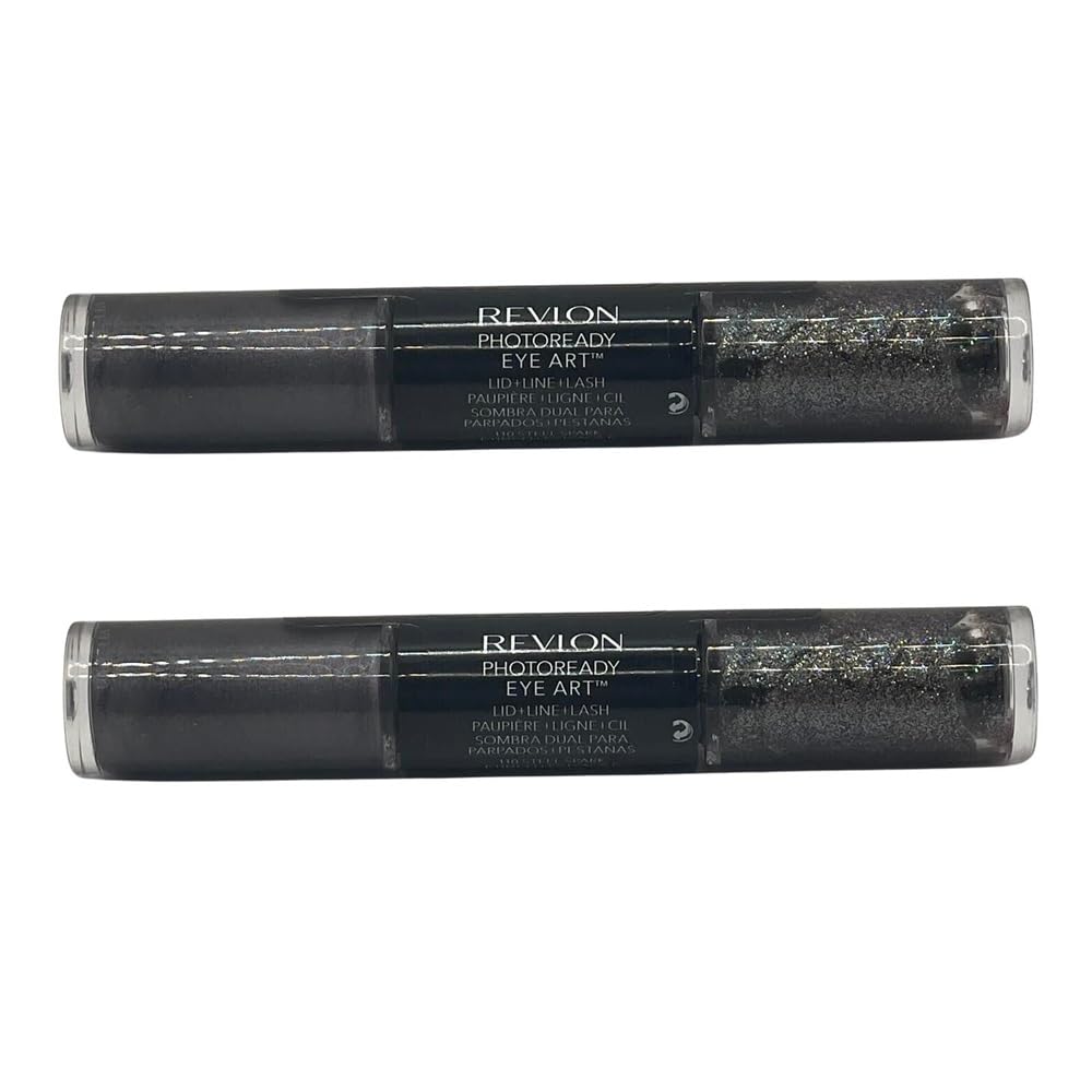 Pack of 2 Revlon PhotoReady Eye Art Lid + Line + Lash , Steel Spark 110 Go for glitz with this dream duo for eyes: High-wattage cream eye shadow and contrasting glitter eye makeup, in one clever tube One end has vibrant, creamy eye color to wash over your lids as eye shadow or to apply as eyeliner The other end has glitter eye makeup, perfect for gleaming accents and highlights on your lids, for lining your eyes, and even for dabbing along your lashes! It's all about the brushes-the cream eye shadow goes on with a doe-foot tip, while the glitter has a super-skinny brush that makes drawing precise lines (or targeting tiny lash hairs) a cinch Shadow: 0.1 fl oz / 0.3 ml X2 Sparkle : 0.1 fl oz / 0.3 ml X2