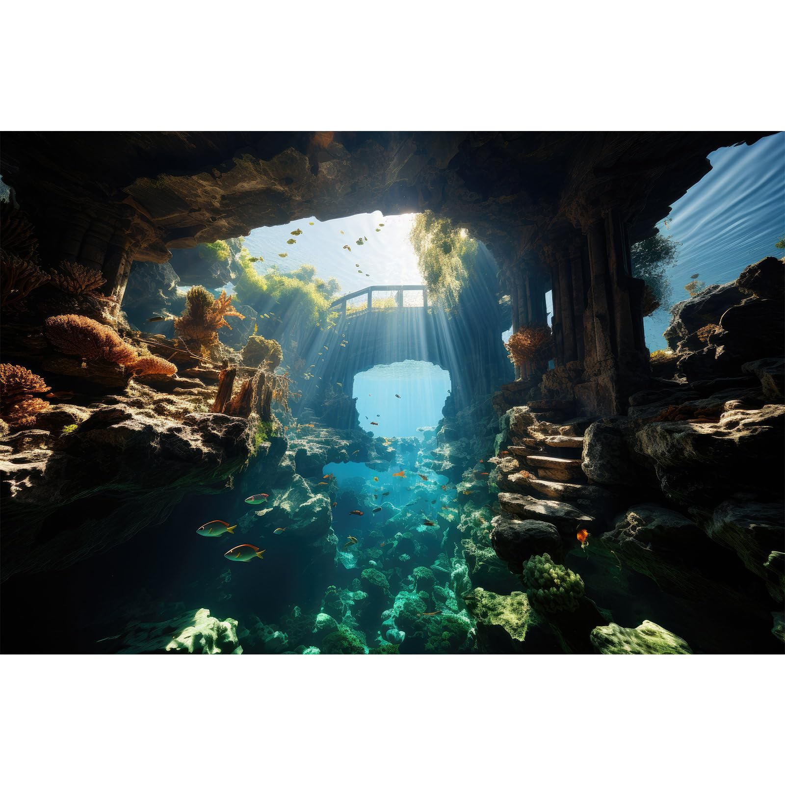 Riivvdise Aquarium Background Aquatic Stone Pillars Vibrant Fish Lively Coral Reef Terrarium Backdrop Deep Blue Sea Under Water World Fish Tank Background Rock Sunlight Rays Wallpaper Vinyl 24x16in