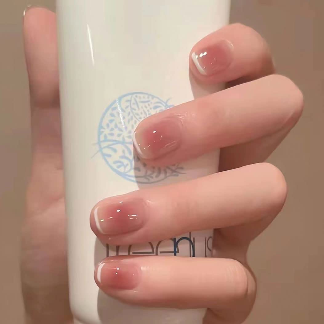 RikView Pink Press on Nails Short Fake Nails French Tip Nails White Nails Glossy Nails for Women 24 PCs/Set