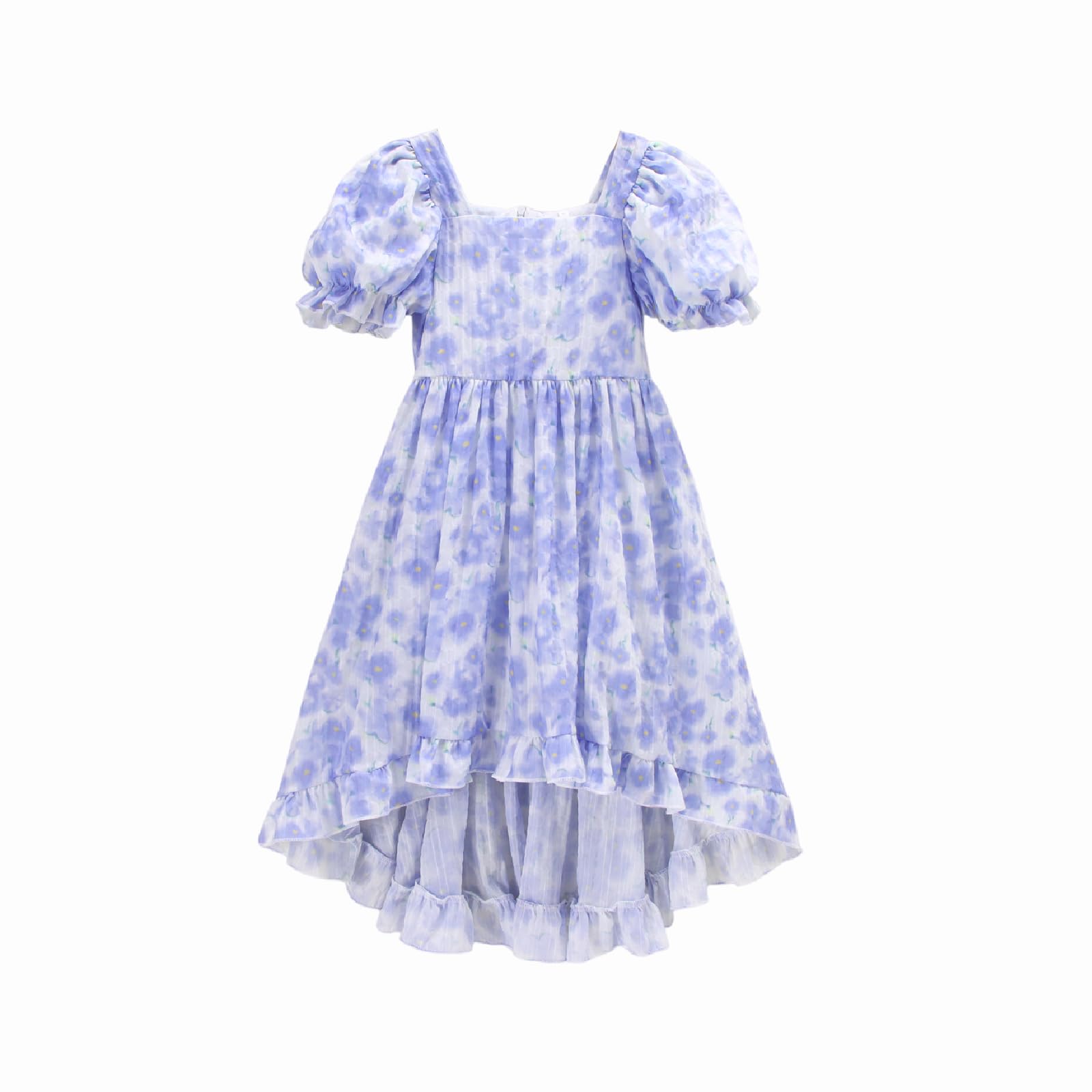 Ritatte Girls Summer Dress Puff Sleeve Square Neck Floral Print High Low Ruffle Hem Casual Midi Dresses 7-12 Years(Blue,11-12 Years(160))