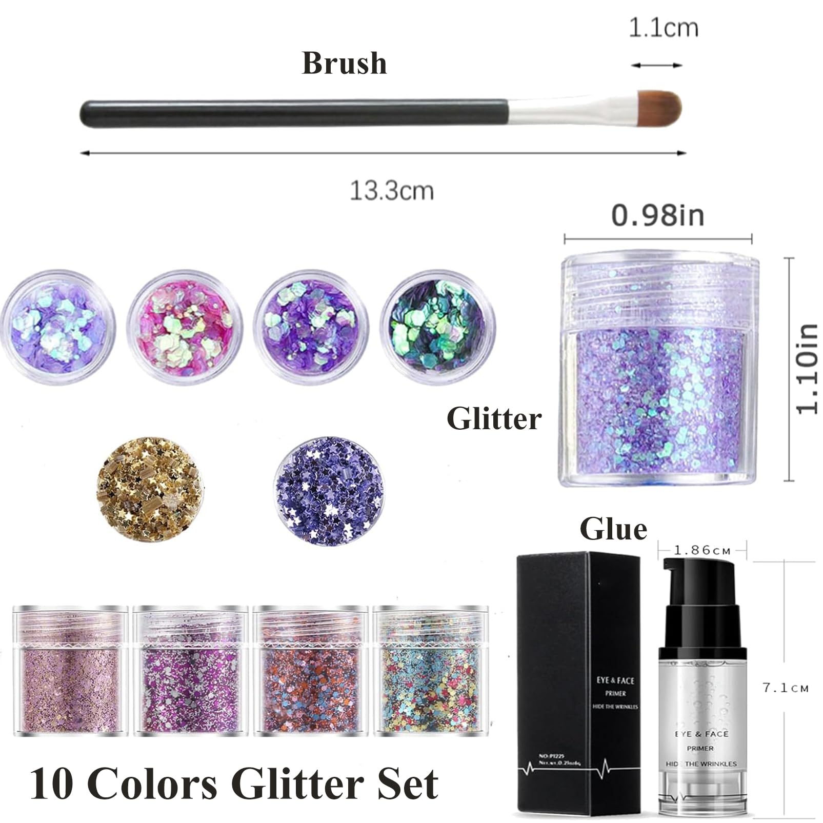 Face and Body Glitter, 10 Colors Festival Glitter, Face Glitter for Cheerleaders, Face Glitter for Face Painting, Body Glitter for Women, Star Glitter Makeup Multi-Functional Face Painting Glitter Versatile glitter makeup set could be used as face sparkles, hair and body glitter, chunky eye glitter, glitter for fabric and also for lips to add shimmer to it. Long Lasting Facial Glitter The body and face glitter would make your hair or body sparkle for up to 12 hours. Easy to Clean Our holographic face glitter would be smooth, fine, shiny, not sticky or greasy and fresh at the same time. Chunky glitter eyeshadow that’s easy to remove with daily clean steps. Widely Used A great body, fabric, hair and face shimmer for all ages , all occasions and all skins. Ideal Gift This face paint glitter set is perfect for women, girls, lady at her birthday, Valentine's day, Thanks giving, Christmas day, Mother's day or other special day as a nice gift. ??Recommended Way to Use: .Mix some of the sparkle face glitter with the face glitter glue ; .Apply them to the face or body with the brush; .Repeat the steps above if more sparkly needed. Package Including:/b> .10*chunky face glitter; .1*body glue for glitter; .1* Rave Makeup Brush;