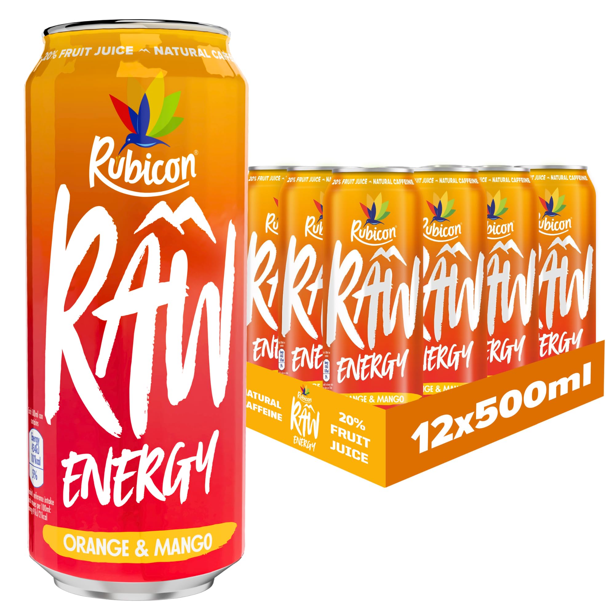 DescriptionProduct DescriptionRubicon RAW is a new kind of energy drink. With high caffeine content from a natural source and 20% fruit juice along with B-Vitamins, Ginseng & Guarana, it’s here to help you make the most of every day.Ingredients"Carbonated Water, Fruit Juices from Concentrate (20%) (Orange 9%, Mango 3.5%, Peach 3.5%, Pineapple 3.5%, Passionfruit 0.5%), Sugar, Acid (Citric Acid), Colour (Carotenes), Acidity Regulator (Sodium Citrate), Natural Flavourings, Stabiliser (Pectin), Natural Caffeine from Green Coffee Beans (0.03%), Sweetener (Sucralose), Antioxidant (Ascorbic Acid), Guarana Extract (0.01%), Ginseng Root Extract (0.01%), Vitamins (Niacin, B6, B12)."DirectionsBest Served ChilledSafety WarningHigh Caffine content. Not recommended for children or pregnant or breast-feeding woman (32ml/100ml)Manufacturer Contact InformationRubicon, A.G. Barr, Freepost RTHL-BCJX-EKJC, Milton Keynes, MK17 8FL, UK.