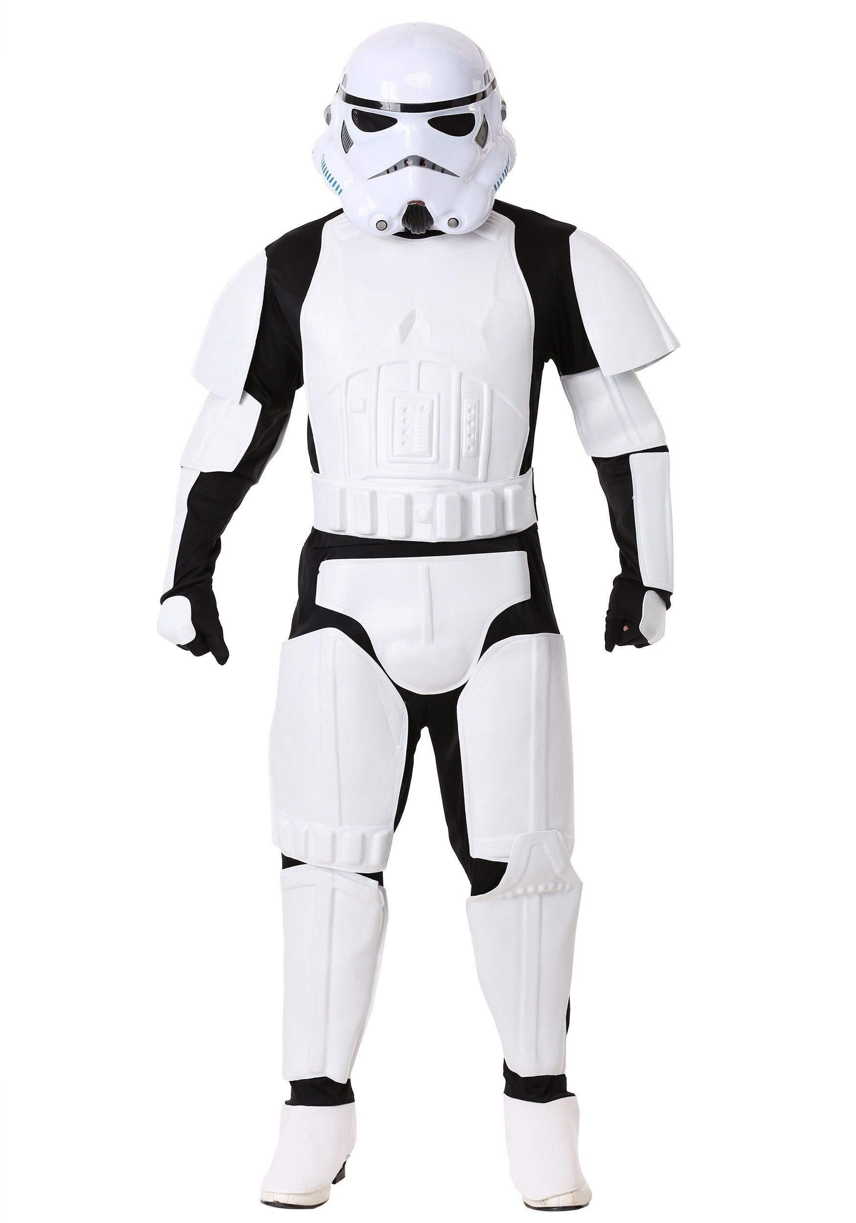 DescriptionAdult mens size official Star Wars deluxe Stormtrooper fancy dress costume includes a black jumpsuit with white moulded details and a two piece helmet.