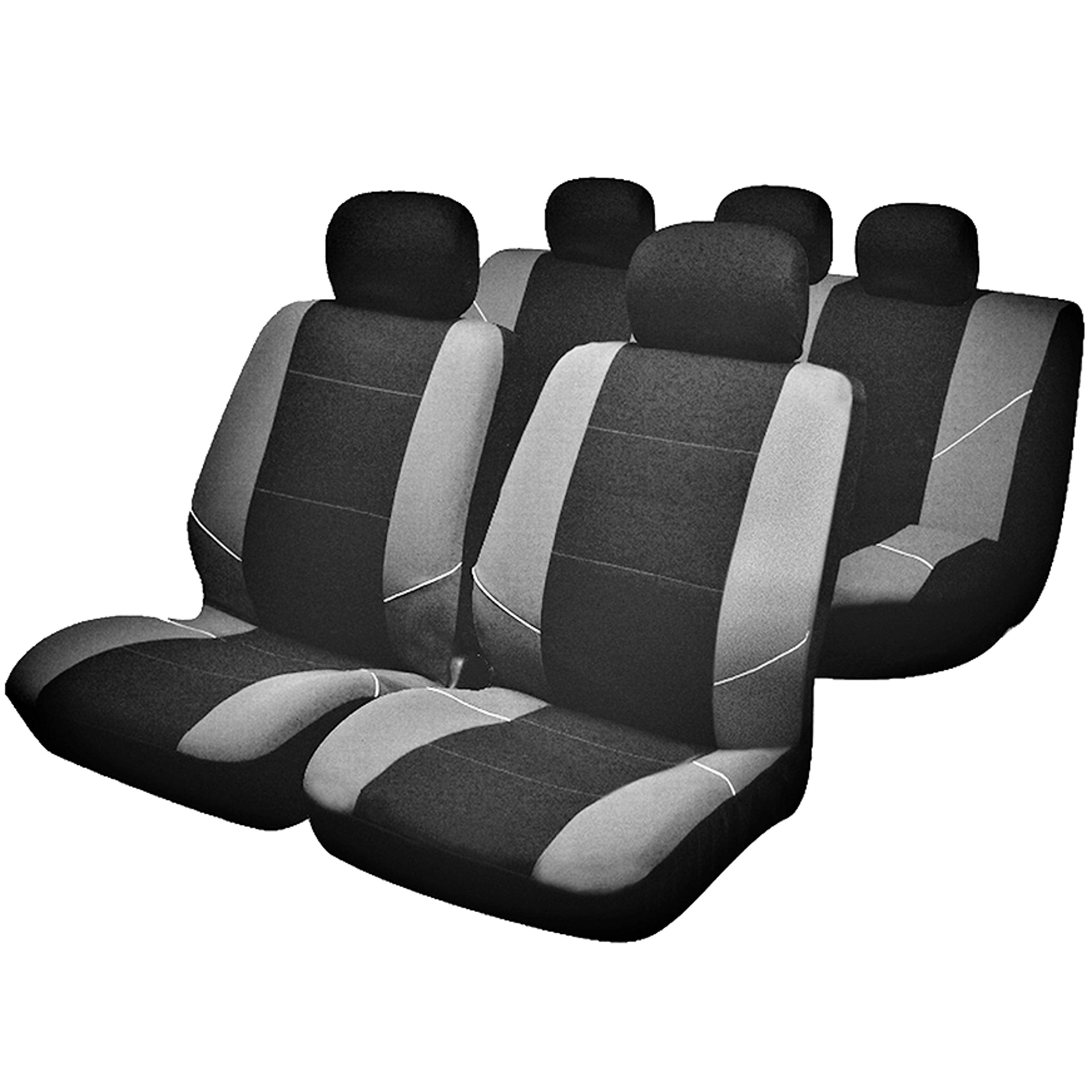 Product DescriptionWHAT ARE THEY?‘Merton’ seat covers by Sakura are a complete set of universal fit seat and headrest covers.WHY DO YOU NEED THEM?Because they are a stylish and inexpensive way to renew worn, faded or damaged car seats or simply to have a new style car interior.IN USEThese covers are easy to fit, are machine washable and side airbag compatible.FEATURESElasticated hems and loop fittings to fit most cars. BOX CONTAINS 2 front seat covers 1 rear bench cover 1 rear seat back cover 5 individual headrest covers Fitting instructionsSet Contains:2 x front seat covers1 x rear bench cover1 x rear back cover5x headrest covers