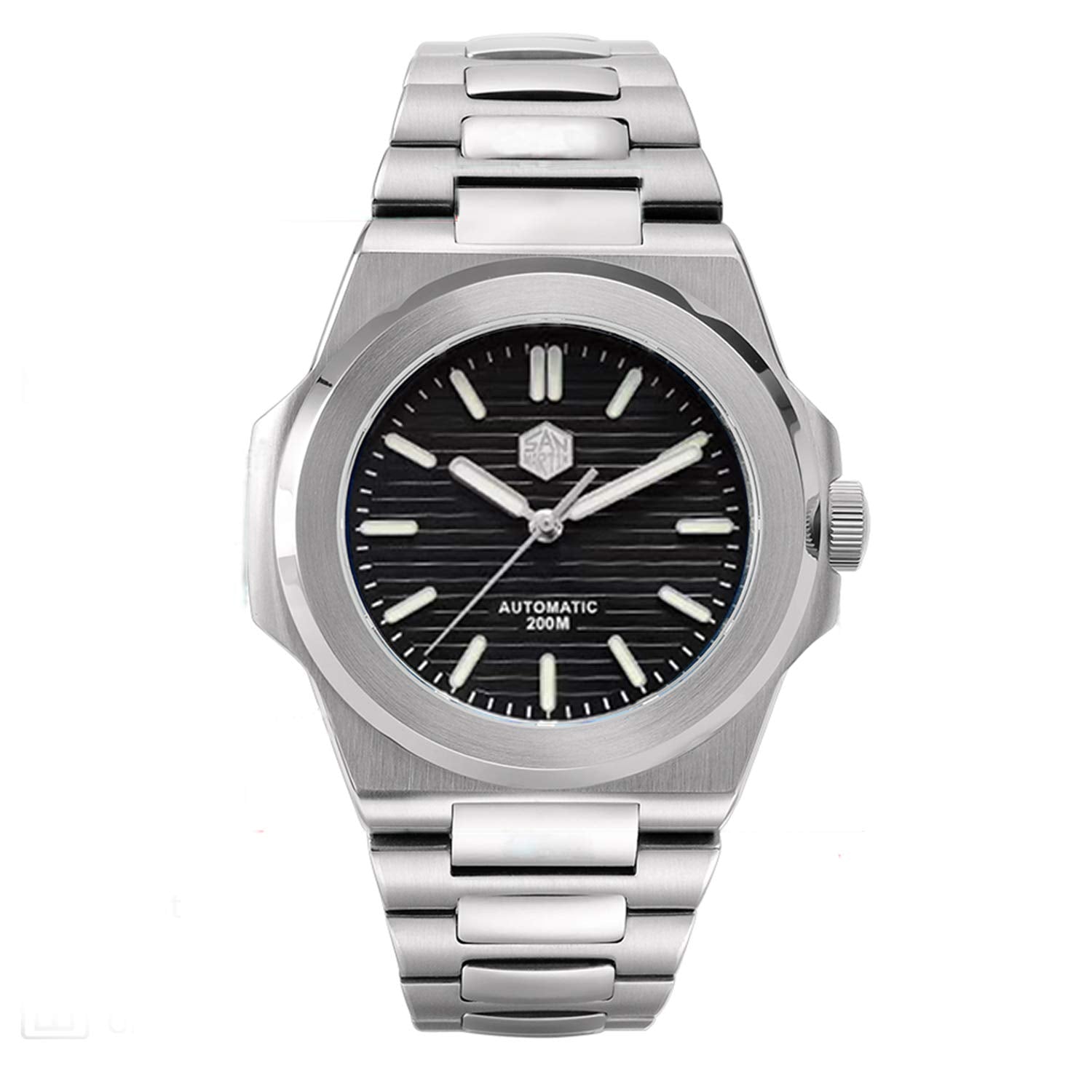 San Martin Classic Luxury Automatic Watches Sapphire Crystal 20ATM Stainless Steel Men Diving Mechanical Business Wrist watch Movement: PT5000/SW200 [automatic mechanical movement] Case: Material-316L Stainless Steel 42 mm in diameter Length 44 mm Thickness 11mm Band width 13 mm Glass: Sapphire Crystal Glass, Swiss AR Coating Dial Color: Blue/Black, 3D Hexagon Applique Logo,Horizontal Stripes Hands: Curved Hands Craft, Luminous Coating Luminous: BGW-9 Blue Light Crown: Screw-down Crown, Case Back: 316L Stainless Steel Solid Screw-down Case Back Strap: 316L Stainless Steel Solid Bracelet Clasp: Folding Clasp With Safety Water Resistant: 20Bar=200 meters