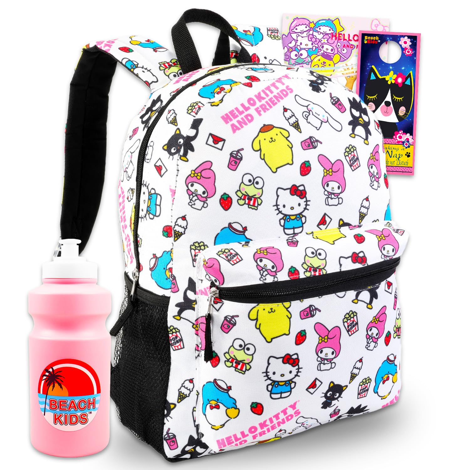 Sanrio Backpack Featuring Tuxedo Sam, My Melody, Badtz-Maru - Bundle with 16” White Sanrio School Backpack Plus Water Bottle, Tattoos, More | Hello Kitty and Friends School Bag. This Sanrio school backpack features adjustable shoulder straps, a zip closure compartment, and a top loop for hanging featuring the colorful artwork of Hello Kitty, Tuxedo Sam, My Melody, and Badtz-Maru. This Hello Kitty backpack for kids has plenty of space for Sanrio folders, notebooks, and books. The front accessory pocket is perfect for holding Hello Kitty and Friends pencils, pens, school supplies, toys, snacks, and more. This durable Sanrio backpack for girls also comes with bonus Hello Kitty stickers, temporary tattoos, a Beach Kids pink water bottle, and a Beach Kids cat door hanger! Officially licensed Hello Kitty and Friends backpack school set for kids. Pair this with other Hello Kitty school supplies. Minimum manufacturer age recommended ages 3 and up.