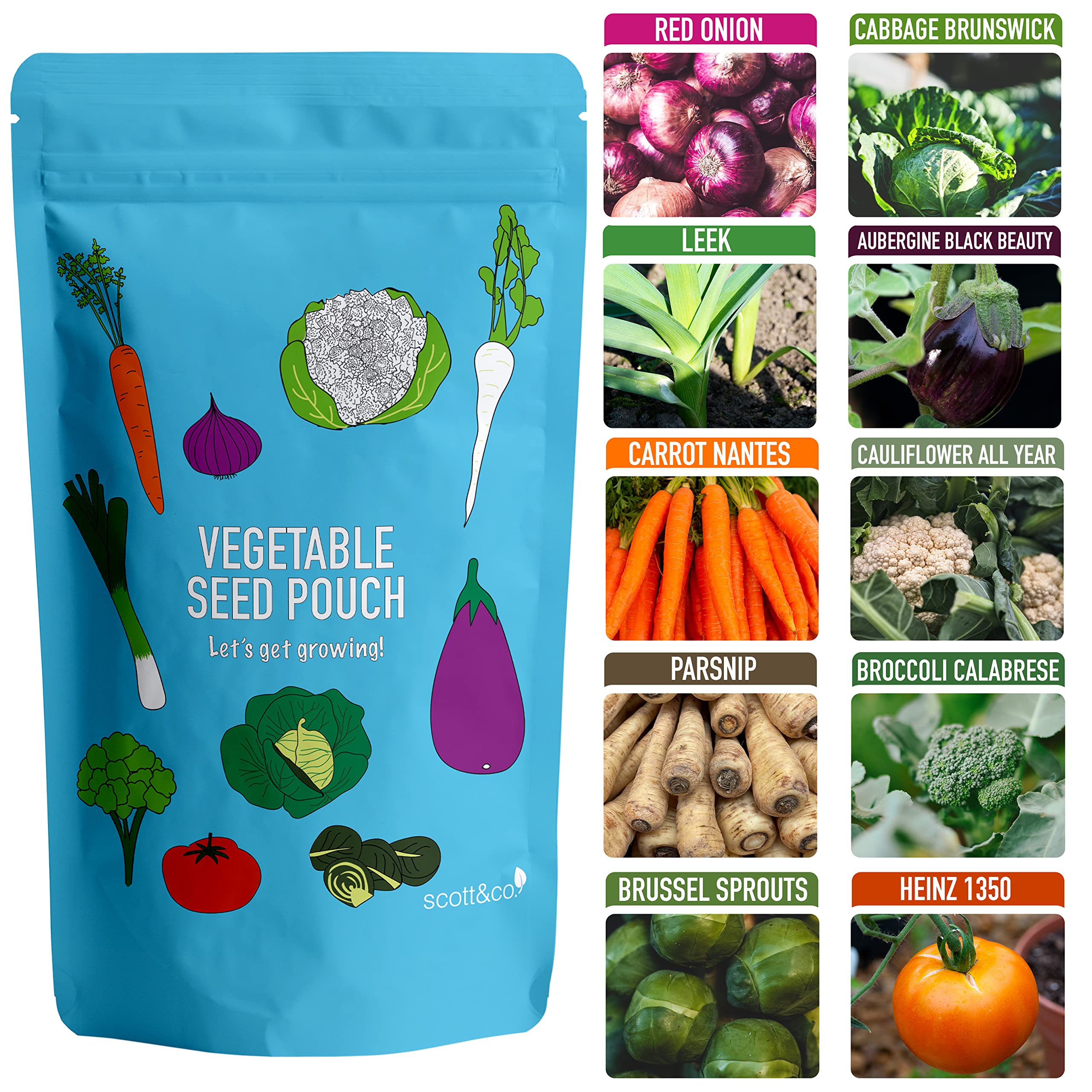 Scott&Co Vegetable seed pouch contains 10 Varieties Of Veg Seeds: 50 x Carrot seeds, 50 x Cabbage seeds, 50 x Onion seeds, 50 x Sprout seeds, 50 x Cauliflower seeds, 50 x Parsnip seeds, 10 x Tomato seeds, 50 x Leek seeds, 50 x Broccoli seeds and 50 x Aubergine seeds. Sowing And Growing Instructions Included. Scott&Co offer a great selection of gift ideas. Our unusual gifts are ideal for gifts for women, gifts for men, gifts for him, gifts for her, gifts for mum and gifts for dad. Our products make great Gardeners Gifts And Also As Christmas gifts, mothers day gifts and fathers day gifts. Our Scott & Co product range are great for presents all year round. We specialize in gardening gifts and gifts for gardeners, our products are great gifts for professional and amateur gardeners.