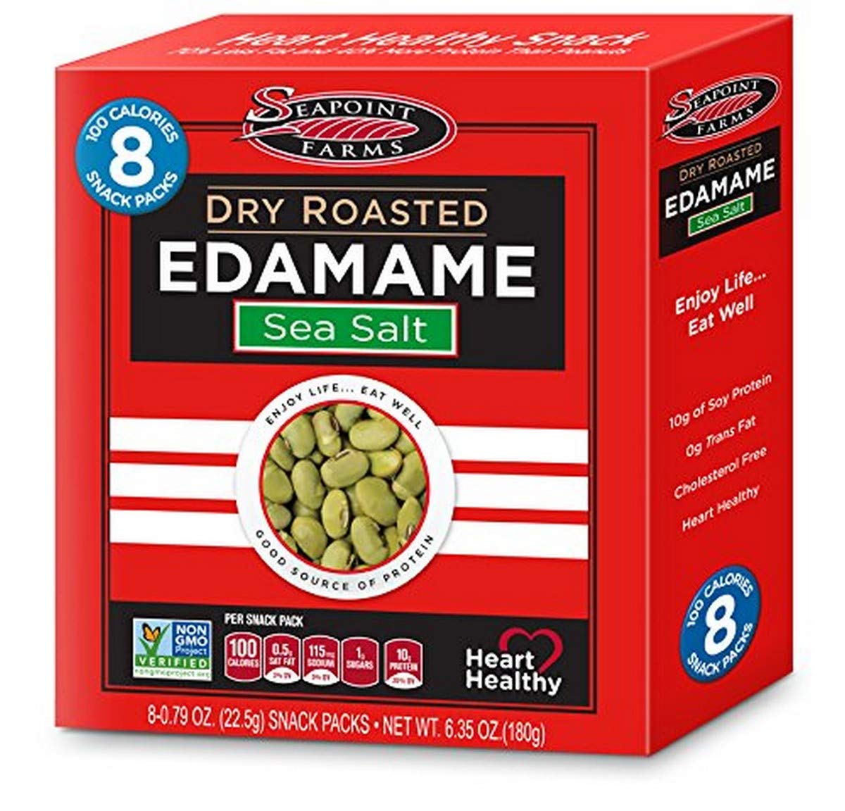 Seapoint Farms Day Roasted Sea Salt Edamame.100 calories 8 snack packs.Enjoy life.Eat well.Good source of protein.Non GMO Project Verified.Per snack pack.100 calories.0.5g sat fat, 3% DV.115mg sodium 5% DV.1g sugars.10g protein, 20% DV.Heart healthy.8-0.79 oz (22.5g) snack packs.8 snacks packs.