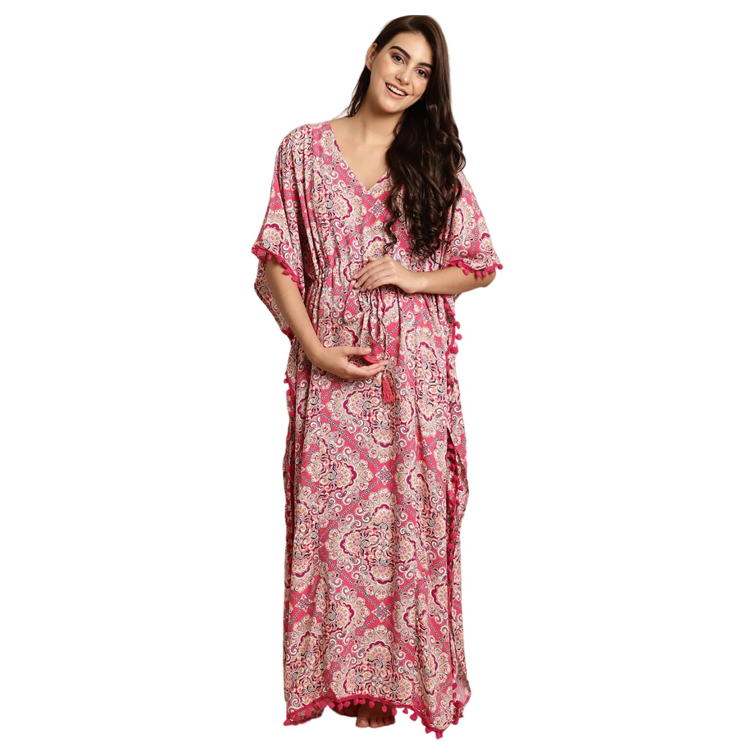 Presenting a pink printed maternity kaftan nightdress gown, featuring a convenient V-neckline, dual feeding zippers, charming pom pom lace accents, and crafted from high-quality fabric. This design accommodates up to 48 inches at the chest, with a length of 46 inches and hips of 50 inches.