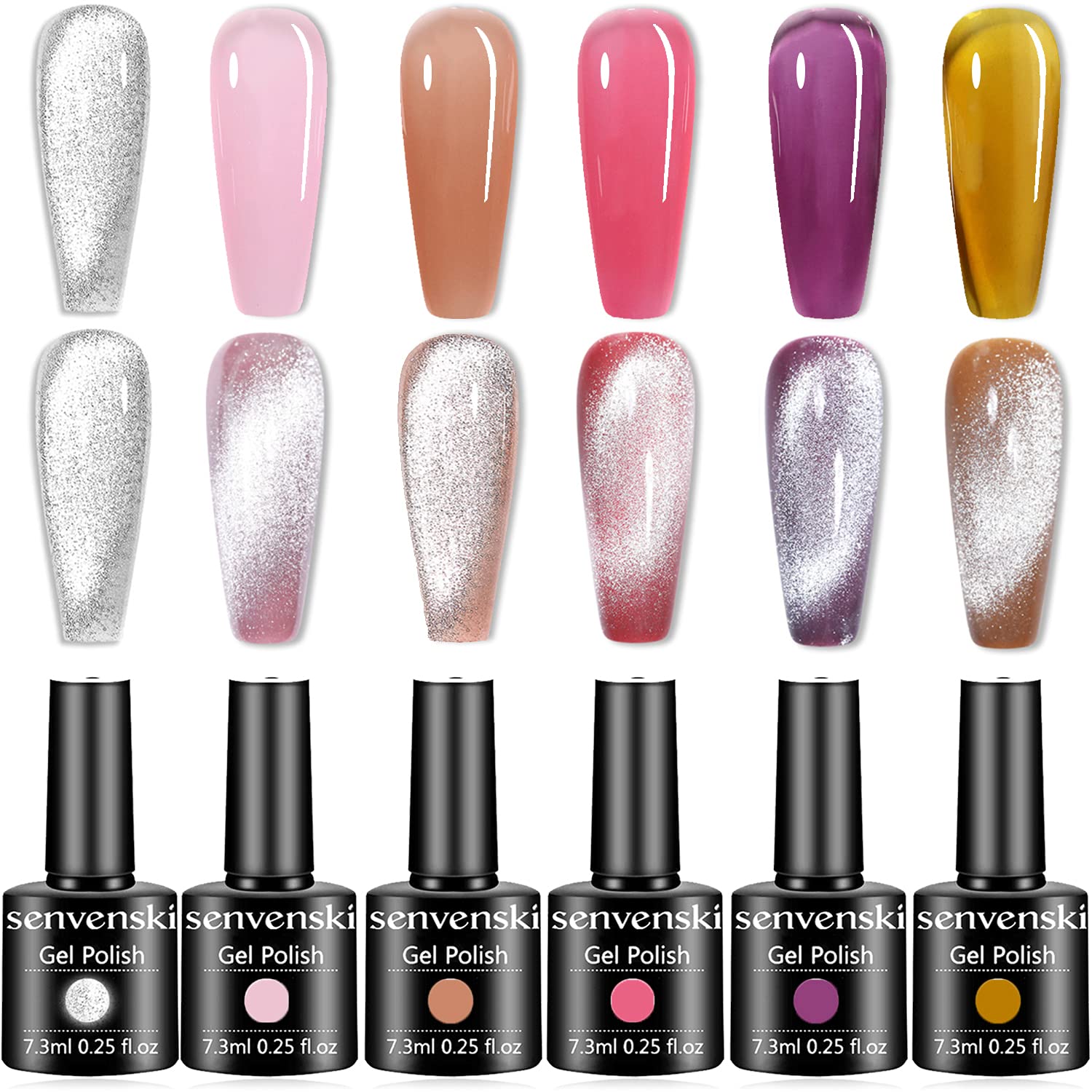senvenski Holographic Glitter Cat Eye Gel Nail Polish Reflective Magnetic Bright Silver with 5 Colors Jelly Gel Nail Polish Sheer Clear UV LED Nail Art Gift Set Kit (MY6-001)