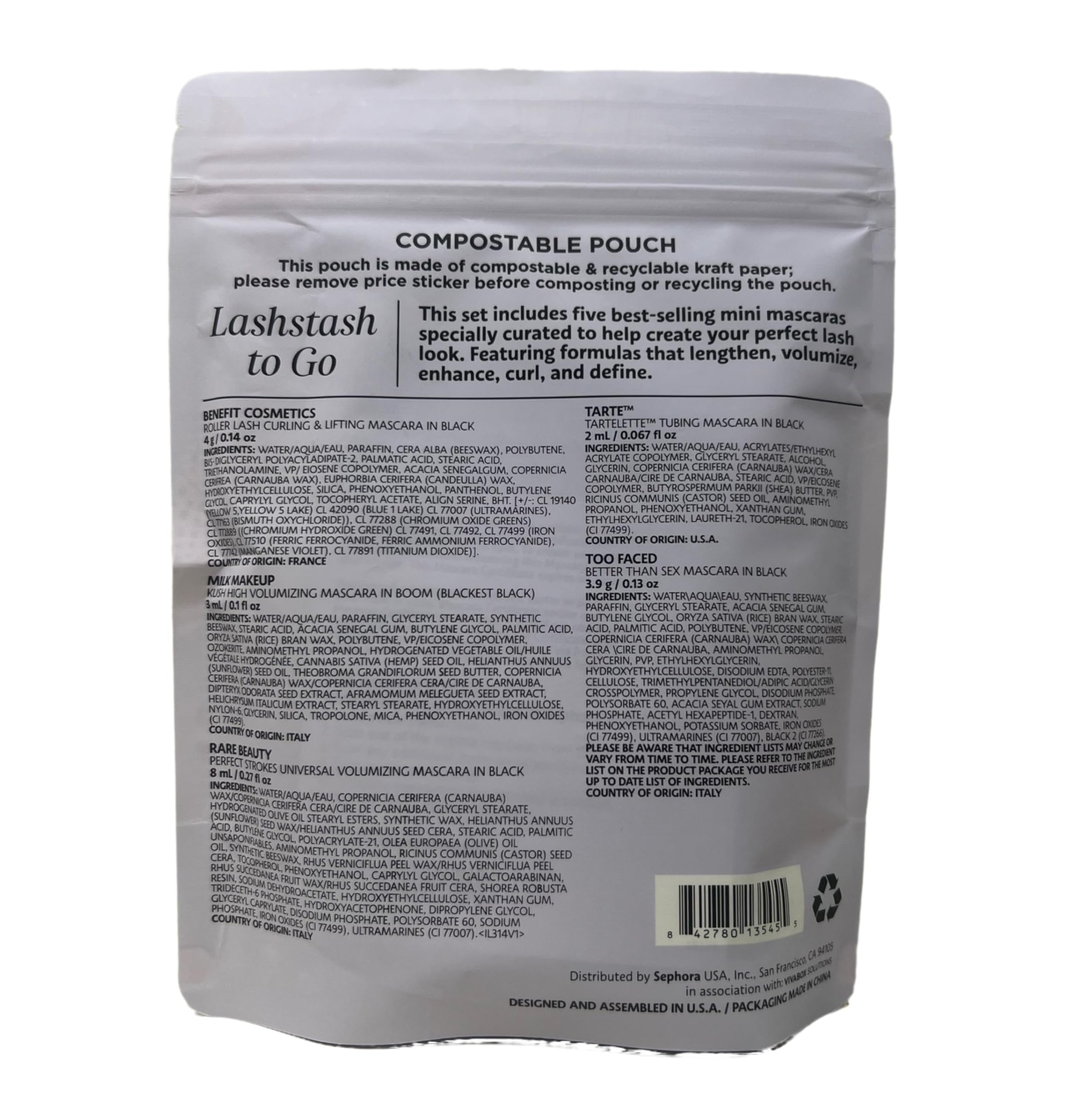 Sephora Favorites Lashstash to Go - Set Includes: 0.14 oz/ 4 g Rare Beauty by Selena Gomez Perfect Strokes Universal Volumizing Mascara in Black (mini size) , 0.14 oz/ 4 g Benefit Cosmetics in Mini Roller Lash Curling & Lifting Mascara in Black (mini size) , 0.14 oz/ 4 g Too Faced Better Than Sex Volumizing & Lengthening Mascara in Black (deluxe) , 0.13 oz/ 4 g tarte mini tartelette tubing mascara in Black (mini size) and 0.13 oz / 4 g Milk Makeup KUSH High Volumizing Mascara (deluxe size)