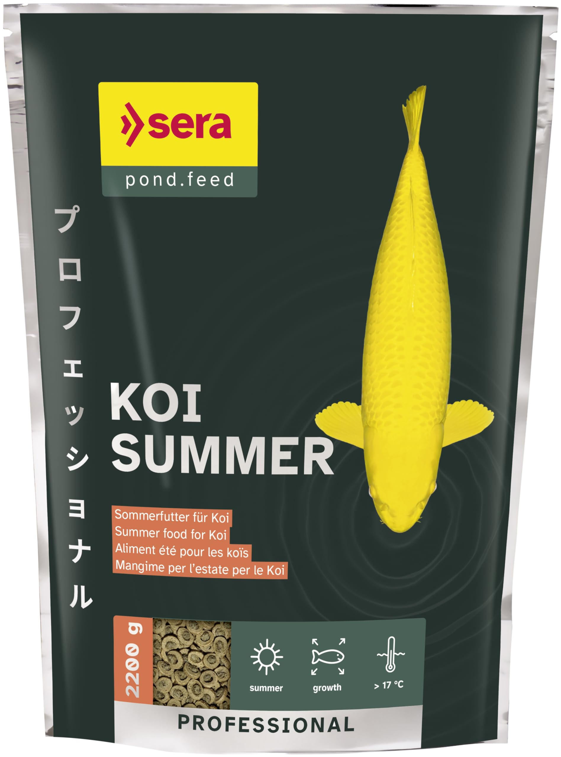 DescriptionProduct DescriptionSummer is growth time for Koi and other pond fish. Plenty of energy is required for this, which is obtained from high quality food. sera KOI Professional Summer Food provides a balanced protein/fat ratio. Strong and healthy growth and optimal energy supply are the result. The unique sera process of co-extrusion allows combining differently treated ingredients. The ring contains high quality proteins and fats according to the natural nutrition spectrum of the fish for optimal digestibility. The core consists, among others, of essential vitamins, minerals and trace elements for healthy growth and a strong immune system.IngredientsFish meal, corn starch, wheat flour, wheat gluten, brewers yeast, wheat germ meal, Ca-Caseinate, fish oil, gammarus meal, mannan oligosaccharides, krill meal, spirulina algae meal, green-lipped mussel meal, stinging nettle meal, herbs, lucerne meal (alfalfa), sea algae meal, paprika, parsley, spinach meal, garlic, carrots. Additives (Vitamins and provitamins): Vit. A 16,800 IU/lb., Vit. D3 820 IU/lb., Vit. E (L-?-tocopheryl acetate) 54 IU/lb., Vit. B1 16 mg/lb., Vit. B2 41 mg/lb., stabilized Vit. C (L-ascorbyl monophosphate) 250 mg/lb. Analytical constituents: Min. Crude Protein 36.2%; Min Crude Fat 5.9 %, Max Crude Fiber 5.5 %, Max Moisture 5.4 %, Max Crude Ash 7.8%Box Containssera KOI Professional Summer Food 2.200 g