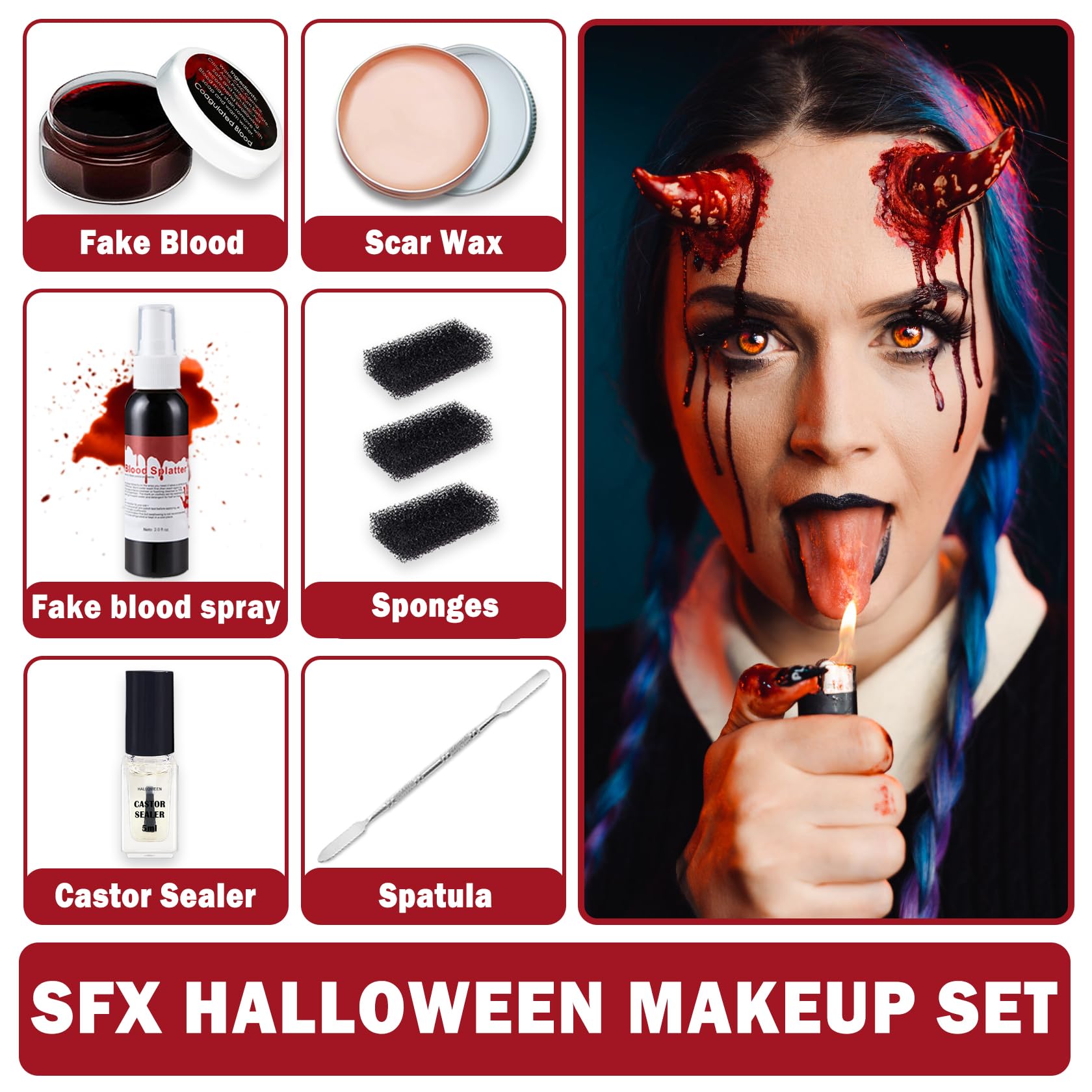 SFX Halloween Makeup Kit,Special Effects Scar Makeup Skin Wax with Spatula,Fake Blood Cream,Fake Blood Splatter Spray,Castor Oil,Black Stippling Sponge for Zombie Cosplay Makeup