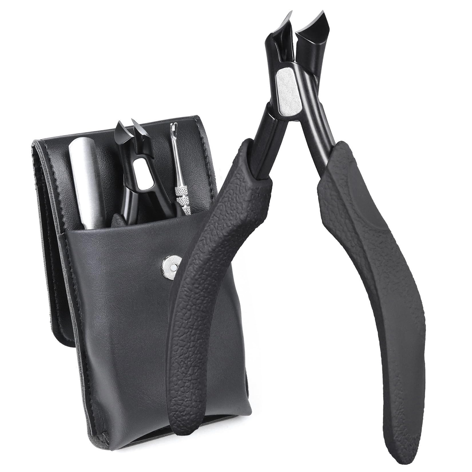 This 3-in-1 nail clipper set includes a nail clipper with a built-in nail file, a long double-sided 180 diamond grits file, and a double-ended dead skin fork pusher. The toenail clippers are designed for ingrown and thick nails. Double sided long nail file can file nails more accurately. Using a rough surface can quickly file thick nails, and a fine surface can make the nails smooth. The double-ended dead skin fork pusher has a cuticle fork on one end to remove cuticles from the edges of nails, and the other end to pry up nails that are growing inward without falling off, and can also be used to remove dirt from between nails. It is suitable for seniors, athletes, arthritis patients, podiatrists, men, women. Keep your hands and feet healthy and pain free. The ingrown toenail clipper is made of high quality surgical grade stainless steel, which is strong and durable and will not corrode or rust. The sharp, durable blades make trimming toenails a breeze. They effortlessly cut through even thicker nails without causing splintering or uneven edges, leaving a clean and tidy result. In addition, this professional toenail clippers come with a rubber protective cover to helps protect the sharp blades when not in use. The ergonomic design of this clipper ensures a comfortable grip. Handle grips cushioned for stable grip when squeezing. It is also designed to minimize hand strain. The long handle is made of rubber and plastic, non-slip and lighter. Built-in high elasticity spring, easy to press without worrying about the spring popping out or falling off. The 0.4 inch wide jaw opening can hold thick and hard nails. Compared to other toenail clippers, the splash-proof design allows you to no longer worry about nail chips flying everywhere. Keep a clean and tidy environment. The pedicure tool is packaged in a leather case, convenient for you to store and carry around. Perfect gift for Father's Day, Mother's Day, Thanksgiving, Christmas and New Year.