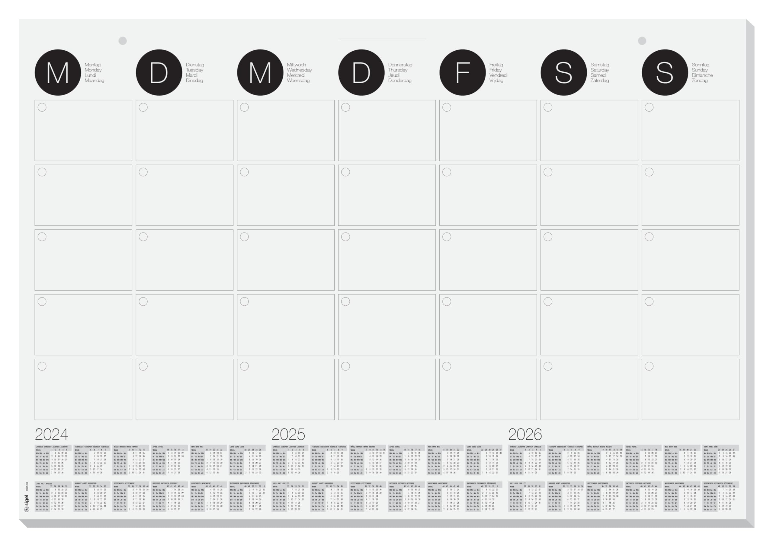A paper desk pad and wall calendar in one - the choice is yours. It comes with a practical monthly planner for organisation at its best. Due to the pre-punched holes, the desk pad is easy to hang on the wall. For the office, home office or kitchen, the practical monthly planner can be customized to meet your needs: write in the month and weekdays and create your own personal plan for the month ahead. The practical three-year calendar serves as a guideline. The paper desk pad comes in a stylish black and white design. The weekdays are printed in a simple yet elegant font along the top of the page, clearly listed in German, English, French and Dutch. The paper desk pad or wall calendar in approximately the A2 format comprises twelve sheets, 59x5 cm x 41 cm in size. Gluing along the bottom edge and partial gluing on the top corners helps prevent ugly dog-eared corners.