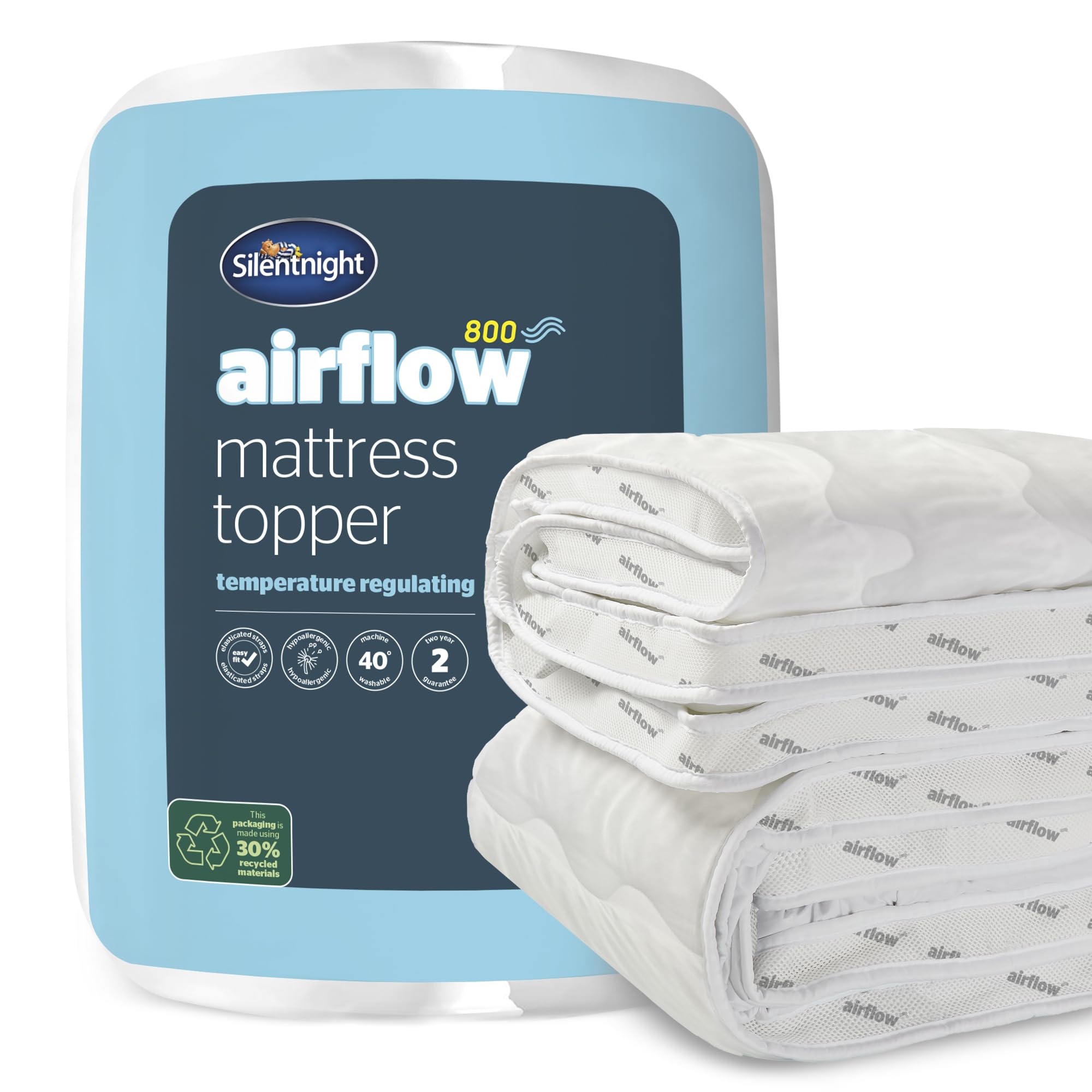 Product DescriptionThe Silentnight Airflow 800 Mattress Topper will transform your existing mattress, providing unparalleled breathability for a comfortably refreshing night’s sleep. Specially designed to increase airflow, the Airflow 800 topper features dual construction which allows air to move freely in-between the layers. The air mesh sides help this air to move freely around your body to keep you comfortable in every season. Deeply filled with hollowfibre, the extra deep 8cm dual layer construction also provides ultimate comfort and will help to refresh and rejuvenate any mattress. The Airflow collection also includes pillows and duvets to keep you comfortable in every season. Silentnight are the UK’s most trusted bed brand with over 75 years’ experience in creating products for every sleeper. Box Contains1 Mattress Topper