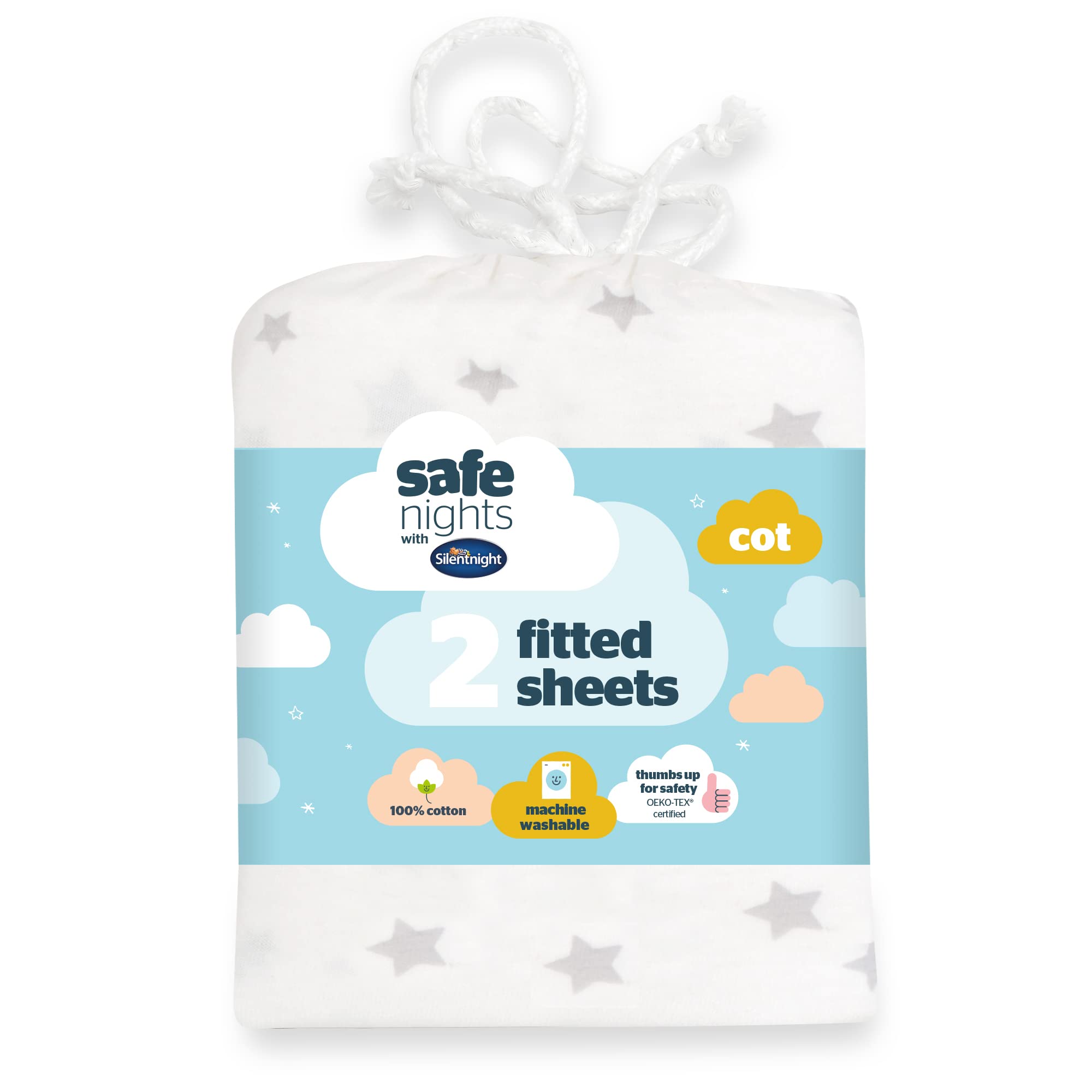 DescriptionProduct DescriptionIt’s important that sheets fit neatly around baby’s cot mattress to provide your baby with the most comfort. These fitted sheets from silentnight’s safe nights range are an essential for every nursery. Made from 100% cotton which is soft and breathable with your babies’ comfort in mind, always. These handy packs of 2 mean you will always have a spare. The sheets feature elasticated edges to provide a snug fit to your cot mattress. Produced in oeko-tex certified factories, this range has the ultimate seal of approval for safety standards. Machine washable at 40°c and can be tumble dried on a low heat. The sheets are durable and designed to stand the test of time, they have been tested to withstand 50 washes. silentnight are the uk’s most trusted sleep brand with over 70 years’ experience in creating products to help the whole family get that ‘great sleep’ feeling. the award-winning silentnight’s safe nights range has been designed with your little one’s comfort in mind, always.Box Contains2 x Cot Sheets
