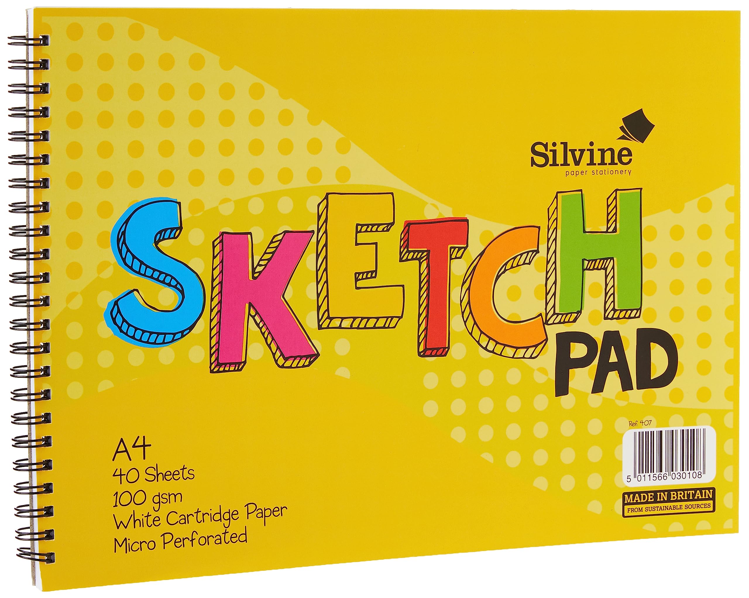 Product DescriptionA4 Landscape sketchpad by Silvine. Bound with twin wire. 40 sheets of 100gsm smooth white cartridge paper. Perforated. Yellow cover.Set Contains:SILVINE A4 SPIRAL SKETCH PAD
