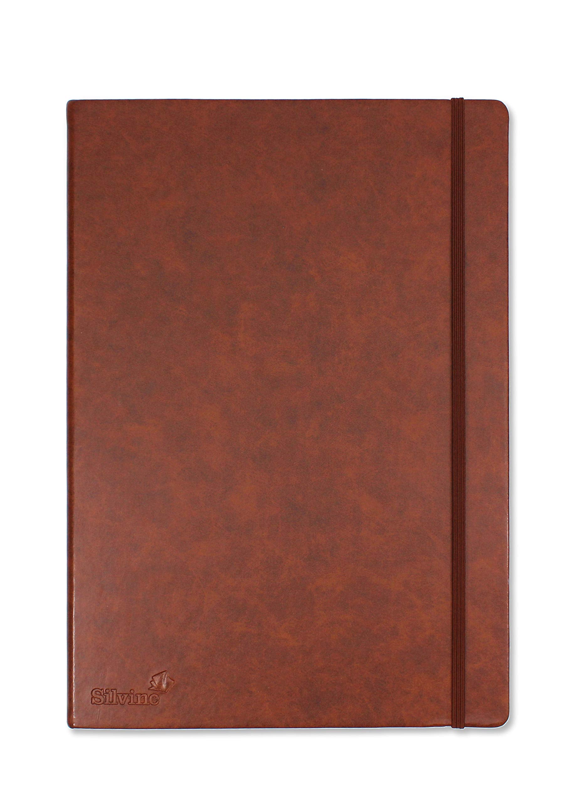 Soft feel cover material. Elasticated strap. Colour coded marker ribbon. Fold out pocket on inside back cover. Ruled cream paper. 160 pages (80 sheets). 90gsm. Size: A4. Tan.