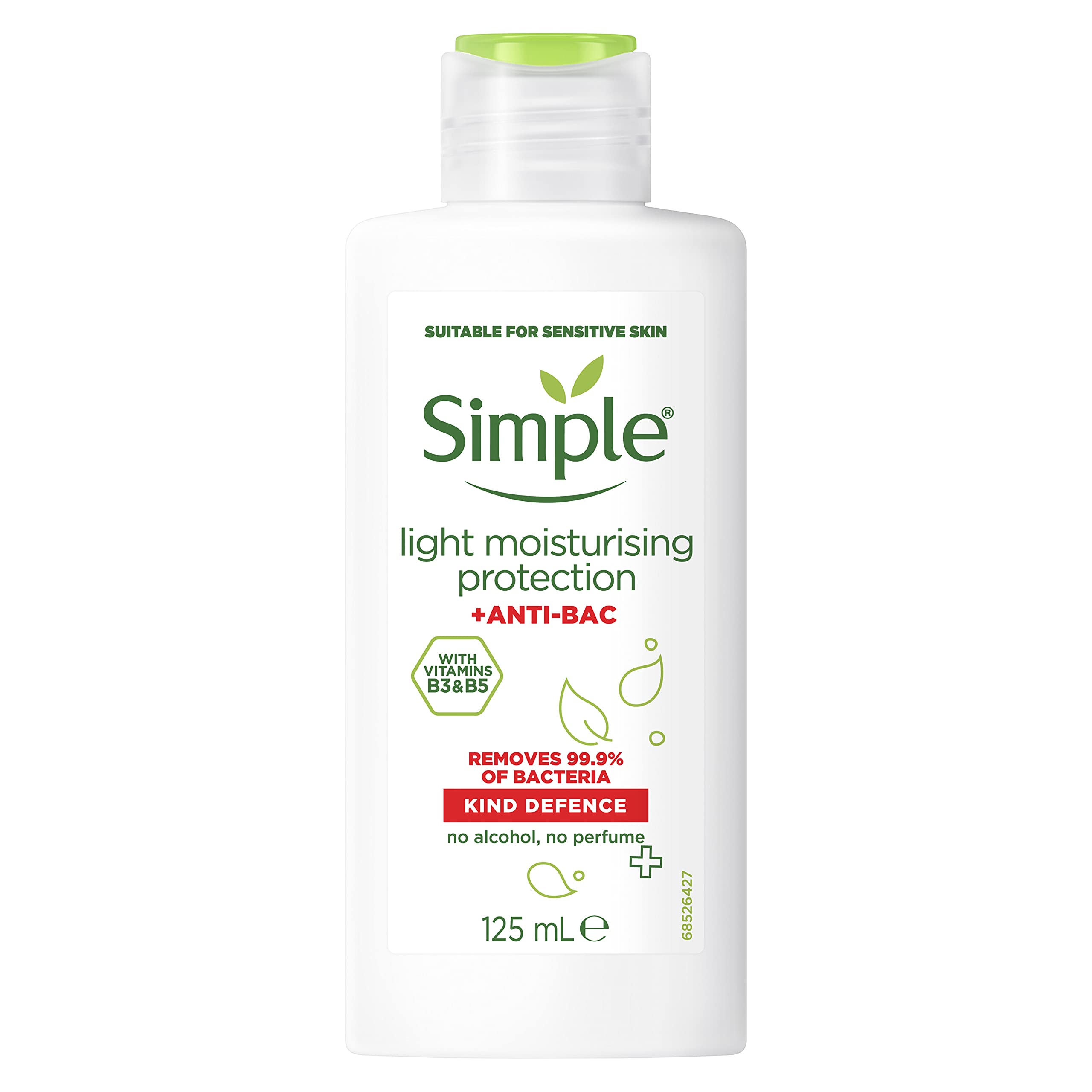 DescriptionDid you know that we touch our face approximately 20 times every hour? Just imagine all the bacteria! That’s why it’s essential to keep your skin clean and protected, and now thanks to Simple Kind Defence +ANTI-BAC Light Moisturiser it’s easy to do. This face cream restores your skin’s protective barrier, leaving your skin feeling instantly hydrated and protected against germs. Developed with an active anti-bac agent CTAC which removes 99.9% of bacteria, our facial moisturiser is made with skin-loving ingredients such as pro-vitamin B5 and vitamin B3 to support your skin’s natural defences. Simple Kind Defence +ANTI-BAC Light Moisturiser contains no alcohol, perfume, colour or mineral oils as well as no harsh chemicals that can upset your skin, making it suitable for even the most sensitive, dry skin. Designed with love in the UK, this face cream is not only kind to skin but also kind to the planet as it comes in a bottle made from 100% recycled plastic. Being kind to animals is also crucial to us, which is why the Kind Defence facial skin care range is vegan and Simple is certified cruelty-free by PETA, meaning we don’t test on animals anywhere in the world. Choose kindness, choose Simple. How to use: Before you start your day, apply product to your face, neck and hands to defend skin from dryness and fight against bacteria.